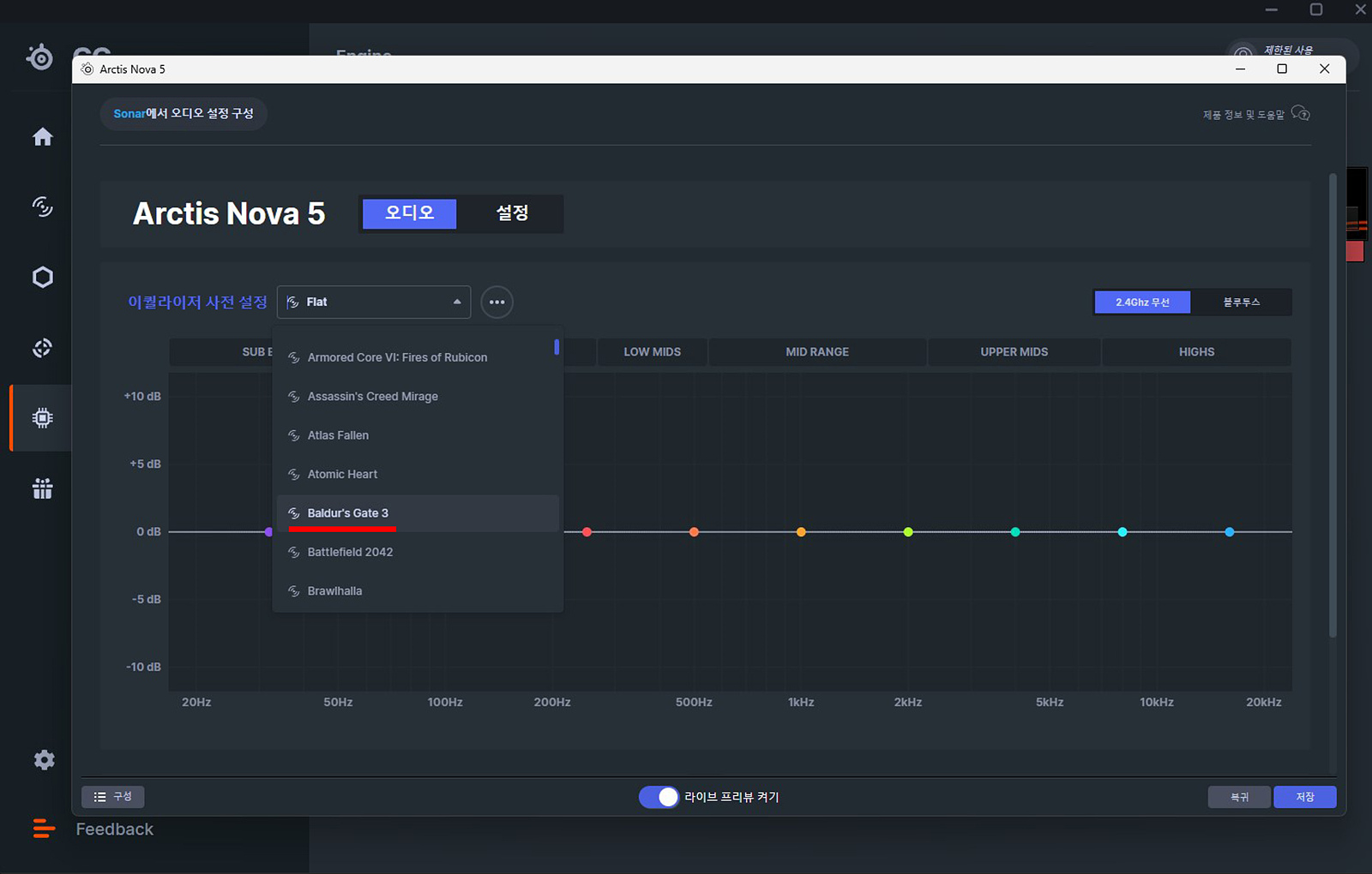 전용 앱의 인터페이스는 직관적으로 되어있어서 바로바로 사용할 수 있으며 무엇보다 게임에 따른 EQ가 엄청나게 많아서 원하는 대로 쉽게 세팅이 가능합니다. 최신 게임들도 지원하고 있으며 계속해서 추가된다고 하니 나중에 나올 신작들도 기대를 할 수 있겠죠.