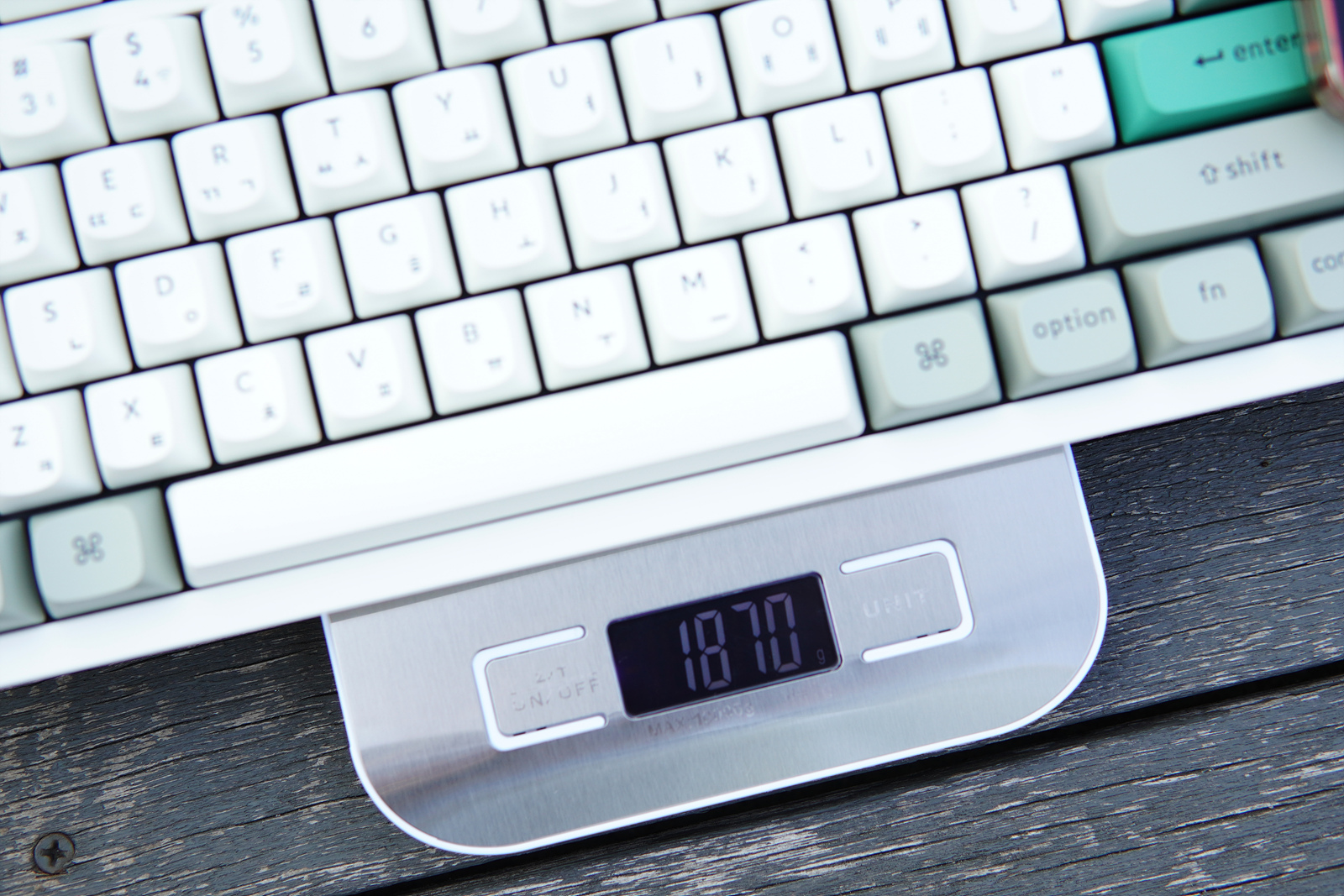 케이블을 제외한 키보드 자체 무게는 1870g으로 측정되었습니다.