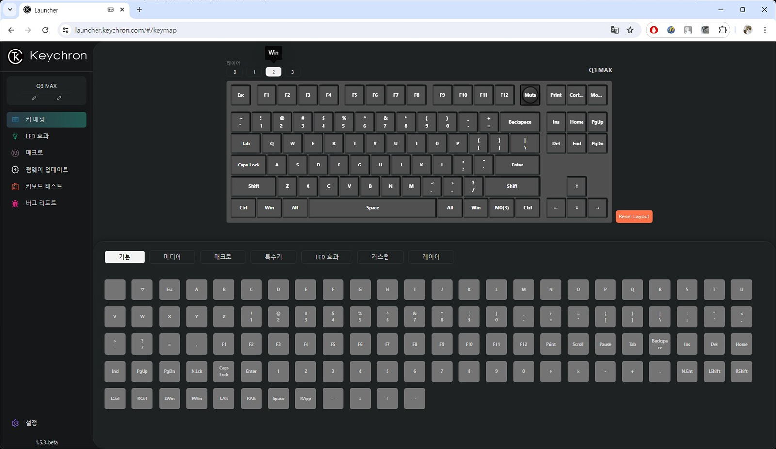 기존 VIA 세팅도 어렵지는 않았지만 키크론 런처의 인터페이스는 조금 더 확실하고 쉽게 바뀌어서 처음 접하는 사용자들도 쉽고 빠르게 사용할 수 있습니다. 위쪽 4개의 숫자(0, 1, 2, 3)처럼 총 4개의 레이어(프로파일)를 사용할 수 있으며 기본적으로 MAC(0, 1)과 Windows( 2, 3)로 설정되어 있습니다.
