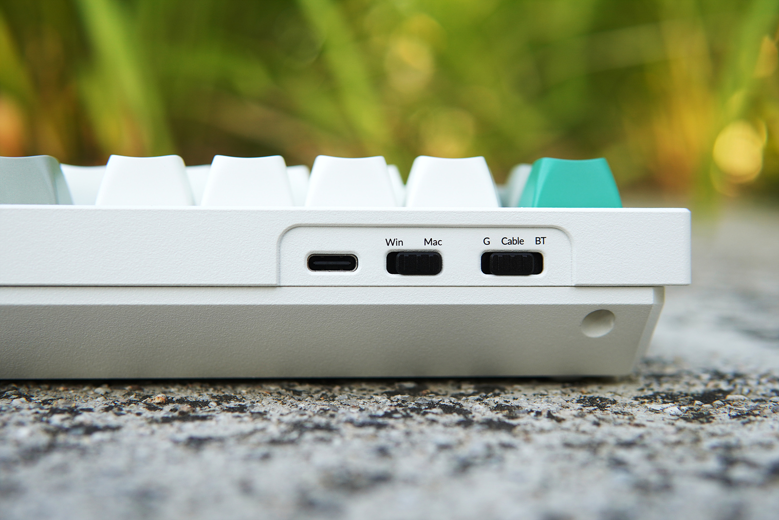 상단 측면에는 Type-C 포트와 사용 모드를 바꿀 수 있는 스위치가 있습니다. Win, Mac, G, Cable, BT 모두 검은색으로 각인이 되어 있어서 시안성이 좋아졌네요.