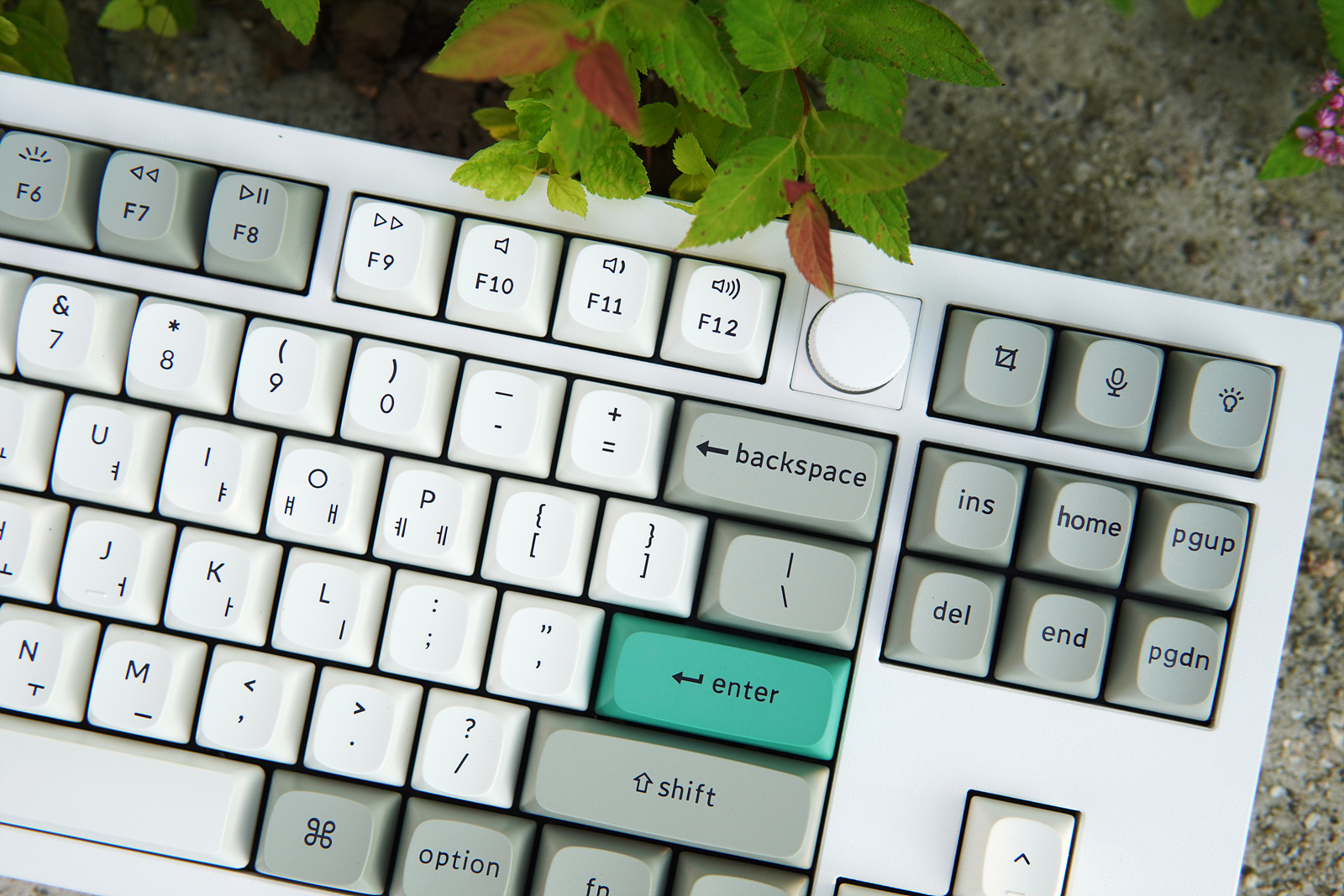 Q 시리즈의 특징 중 하나인 노브(Knob)는 F12와 캡처 사이에 배치되어서 기본 배열을 그대로 지키고 있습니다. 노브는 키크론 런처를 이용해 다양하게 조절(줌, 밝기, 소리 등)할 수 있습니다. 포토샵에서 브러시 크기를 바꿀 수도 있으며 프리미어나 베가스와 같은 영상 편집 시에 타임라인 스크롤로 사용하면 상당히 편리합니다.