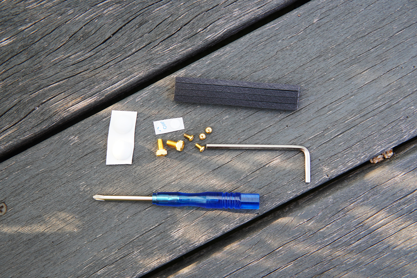 Q 시리즈가 커스텀 라인이라는 걸 알 수 있는 금색 나사와 공구(육각 렌치, 십자드라이버)뿐 아니라 추가 범폰과 개스킷이 포함되어 있습니다.