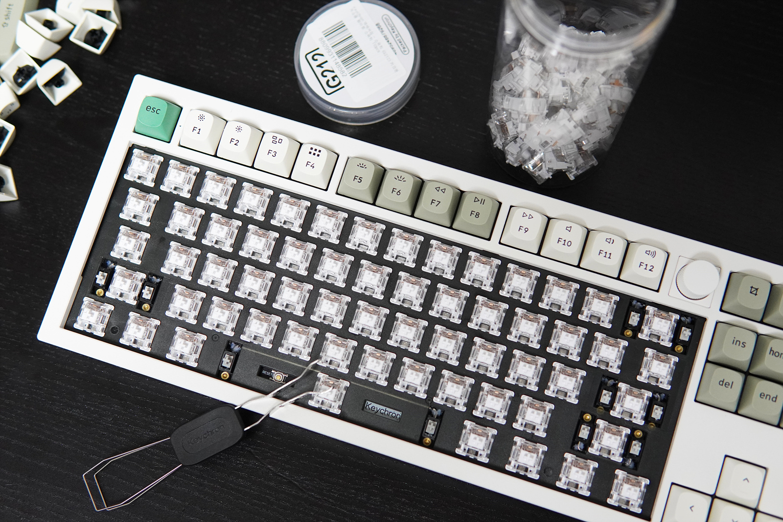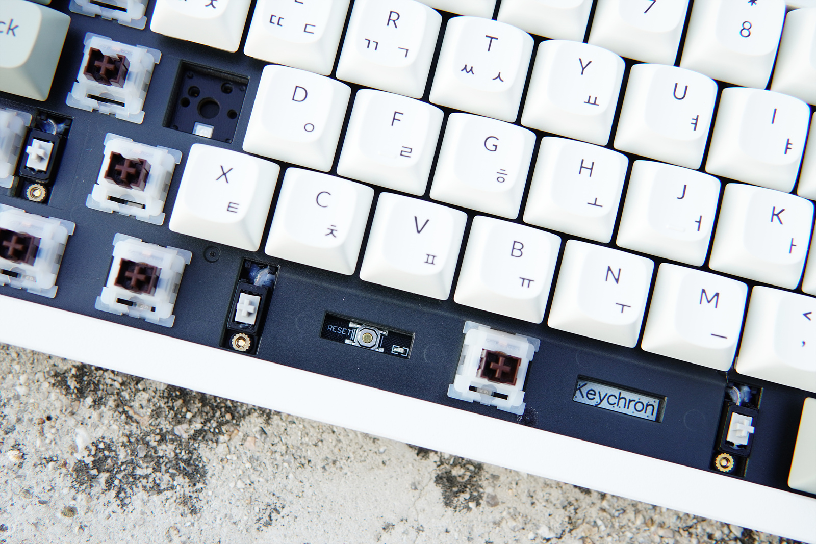 저소음 갈축 스위치를 모두 제거한 뒤 키저화(키크론 저소음 화이트) 스위치로 교체를 했습니다. 키크론 스위치뿐 아니라 3핀 5핀 스위치는 모두 사용할 수 있으며 장착할 때는 스위치의 핀이 휘지 않도록 조심하시기 바랍니다.