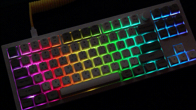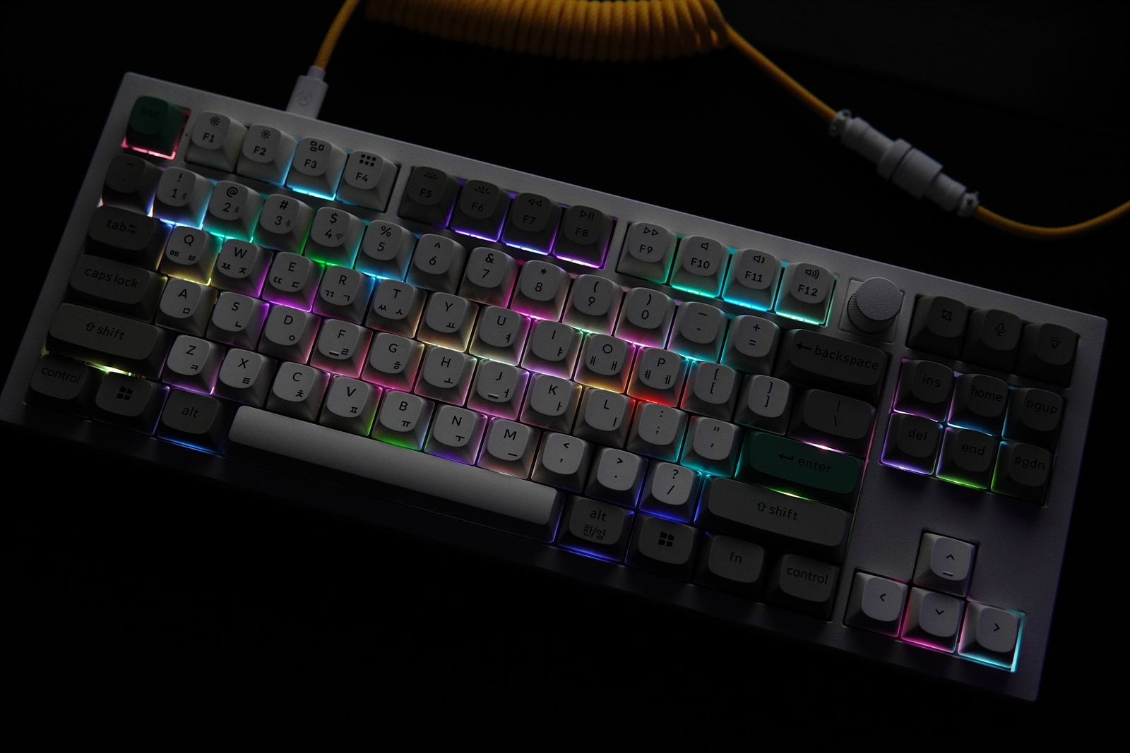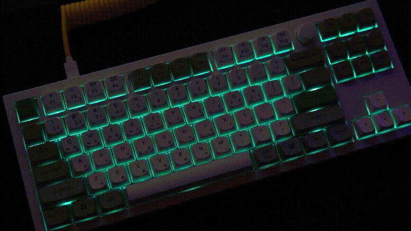 케이블을 연결하거나 무선 모드로 전원을 켜면 RGB LED를 확인할 수 있습니다. 이중 사출 키캡이 아니라 키캡 자체에 LED가 표시되지는 않지만 않지만 어두운 곳에서 사용하기에는 부족하지 않습니다.