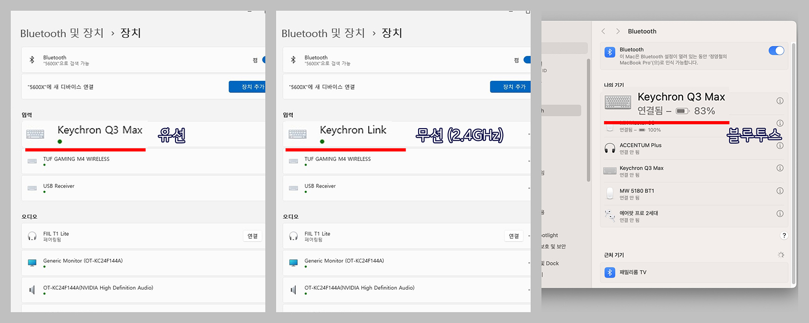 키크론 키보드는 유선 & 무선 & 블루투스(3대)까지 총 5대를 연결할 수 있으며 블루투스는 Fn + 1, 2, 3의 조합으로 다양한 기기에 연결해서 사용할 수 있습니다.