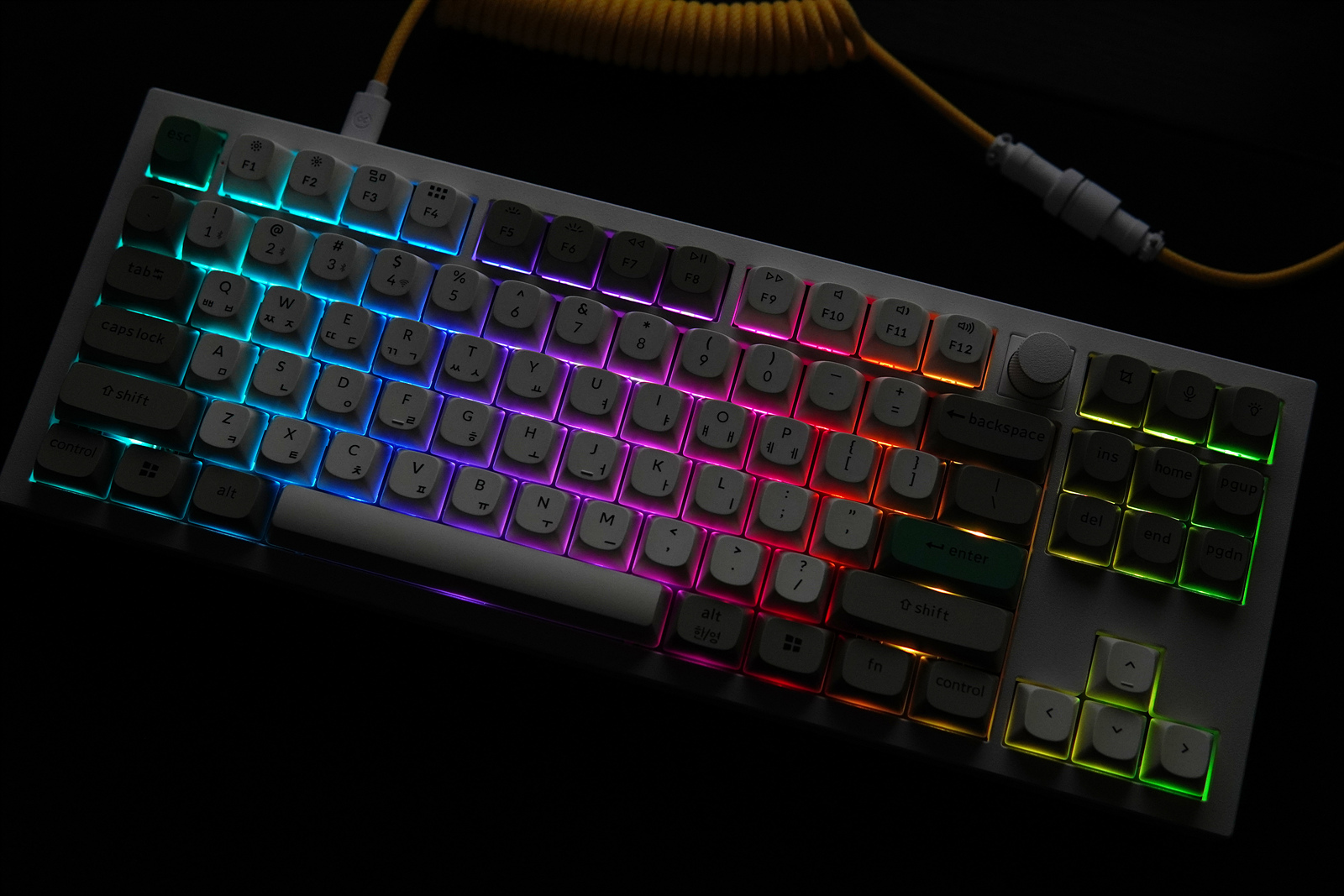 케이블을 연결하거나 무선 모드로 전원을 켜면 RGB LED를 확인할 수 있습니다. 이중 사출 키캡이 아니라 키캡 자체에 LED가 표시되지는 않지만 않지만 어두운 곳에서 사용하기에는 부족하지 않습니다.