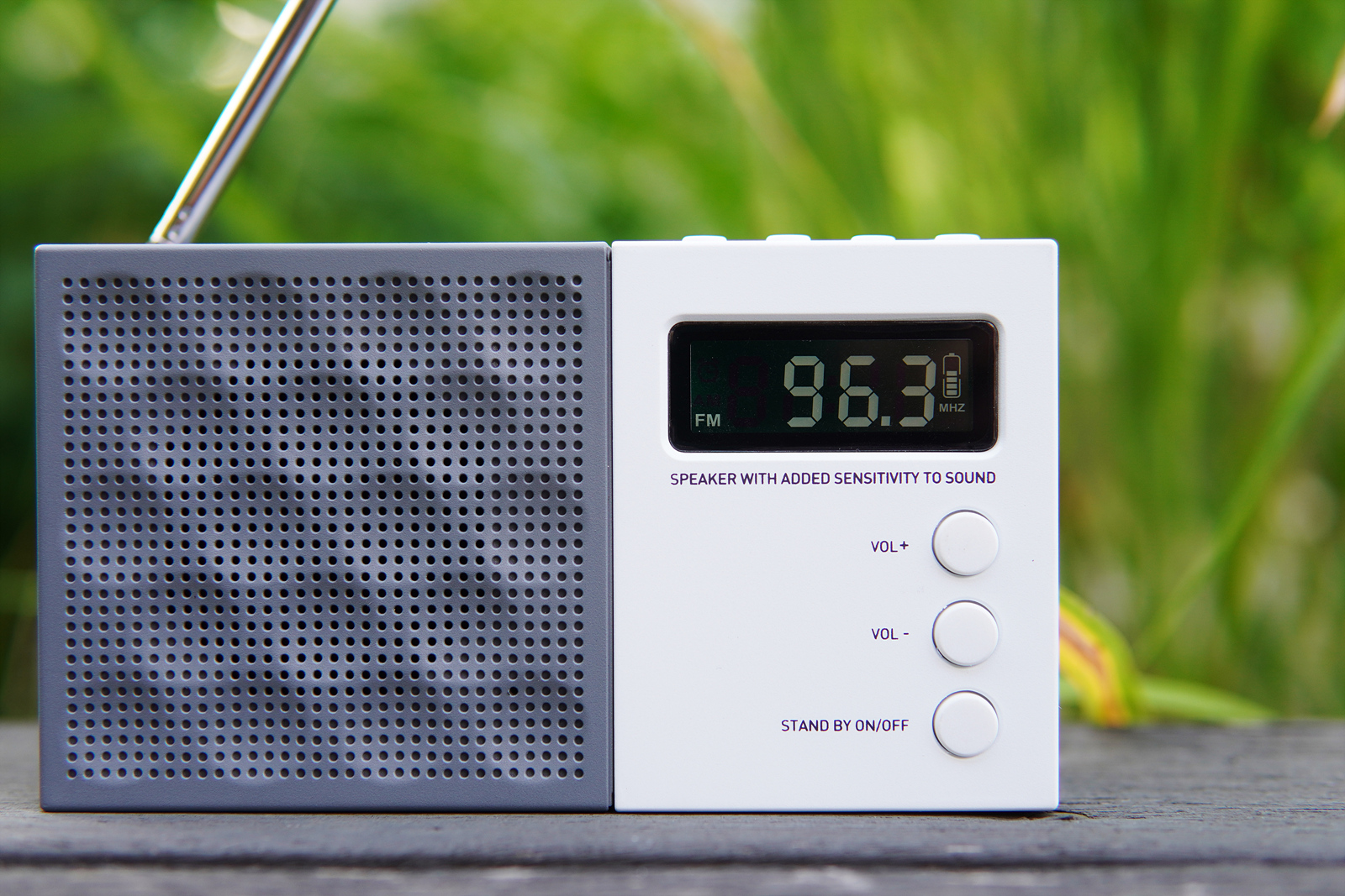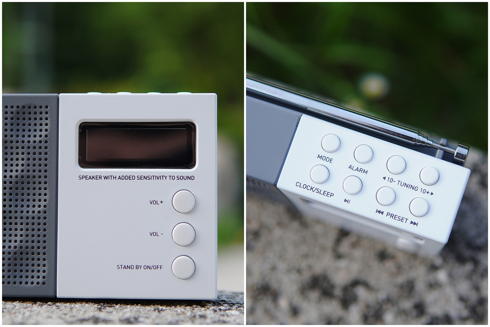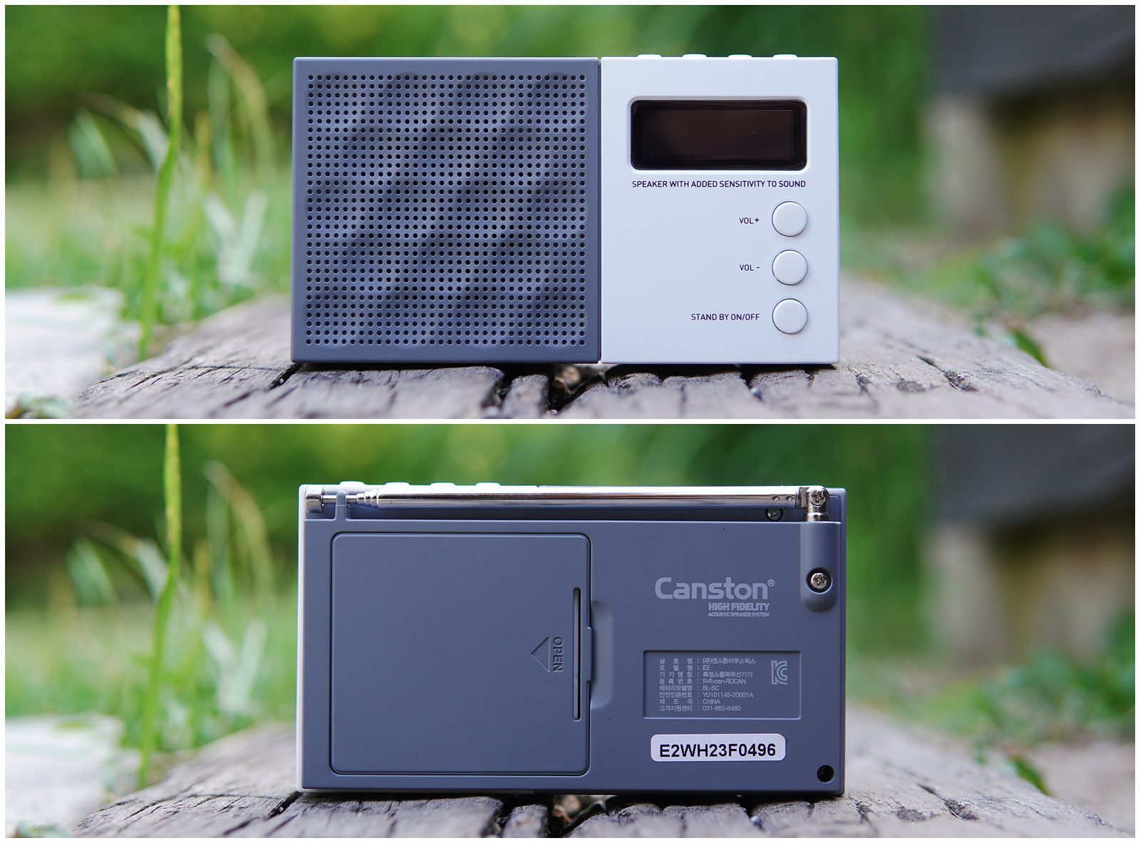앞쪽에는 스피커 유닛과 LCD 디스플레이가 있으며 아래쪽에는 가장 많이 사용되는 볼륨 조절과 전원 버튼이 배치되어 있으며 뒤쪽에는 라디오에 필수라고 할 수 있는 안테나와 배터리 수납공간이 있습니다.