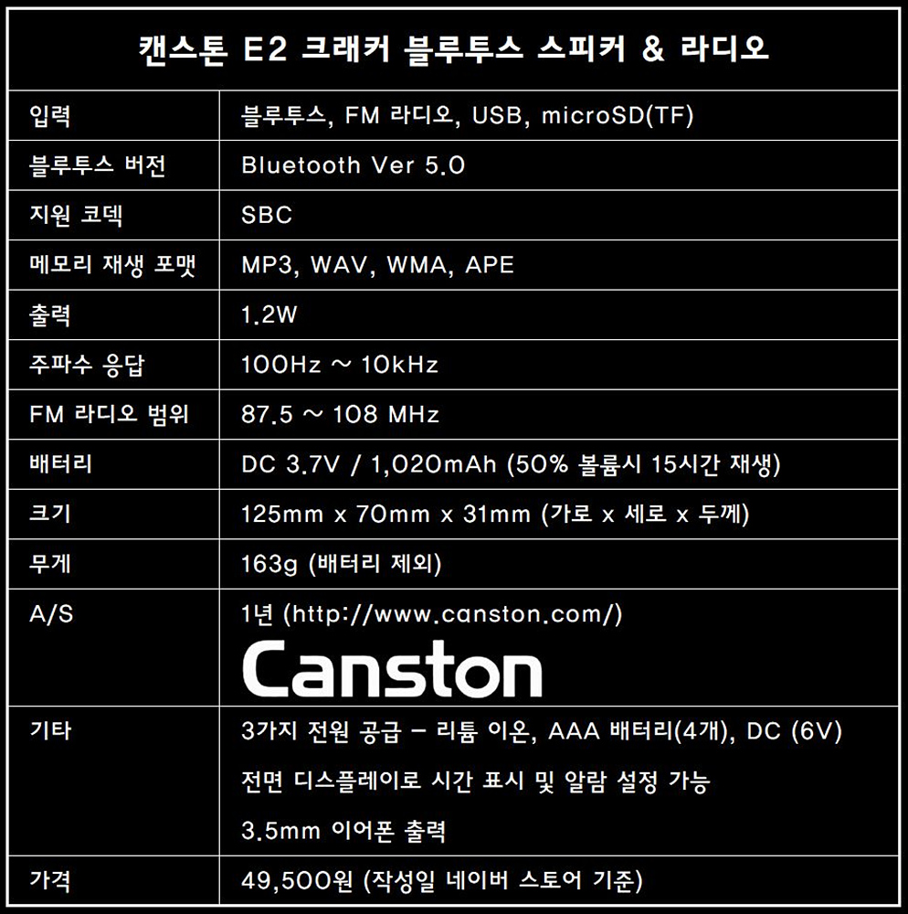 블루투스 코덱은 aptX나 AAC는 지원하지 않고 SBC만 지원이 됩니다. 보통 블루투스 스피커에서 SBC만을 지원하는 건 단점이라고 할 수 있겠지만 캔스톤 E2 크래커는 기본 베이스가 라디오이고 블루투스나 메모리 지원은 부가 기능이라고 생각해서인지 이해가 되는 부분이었습니다.