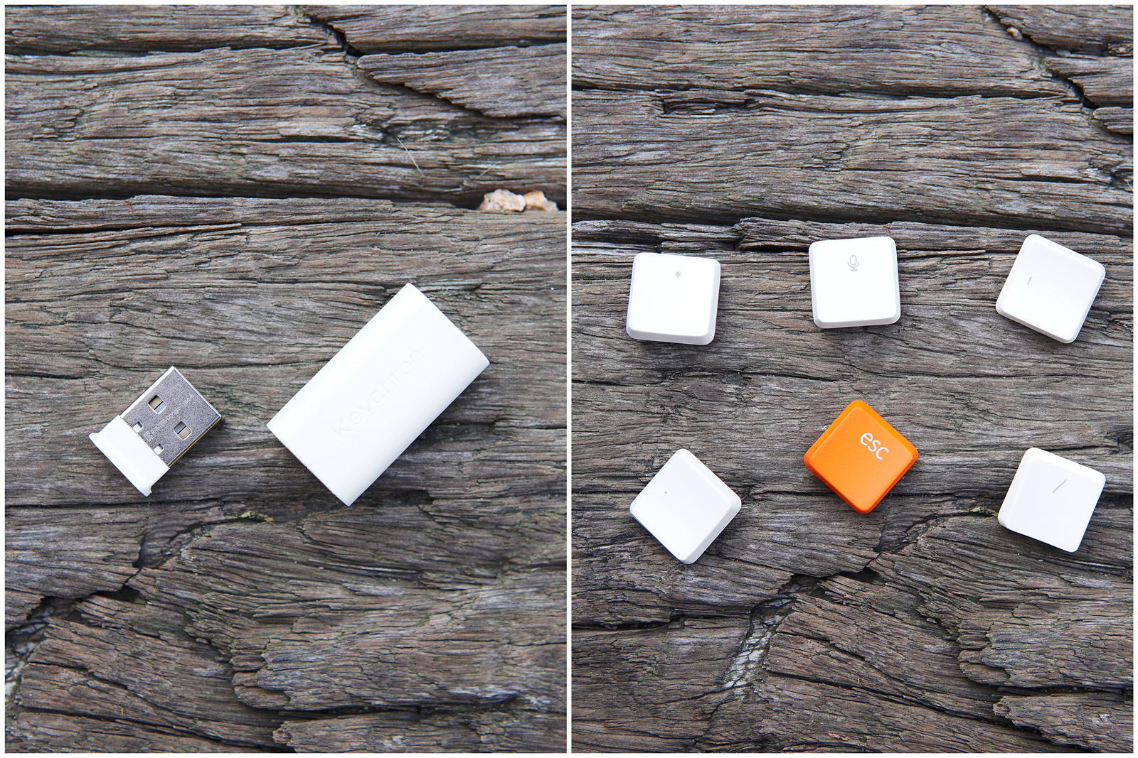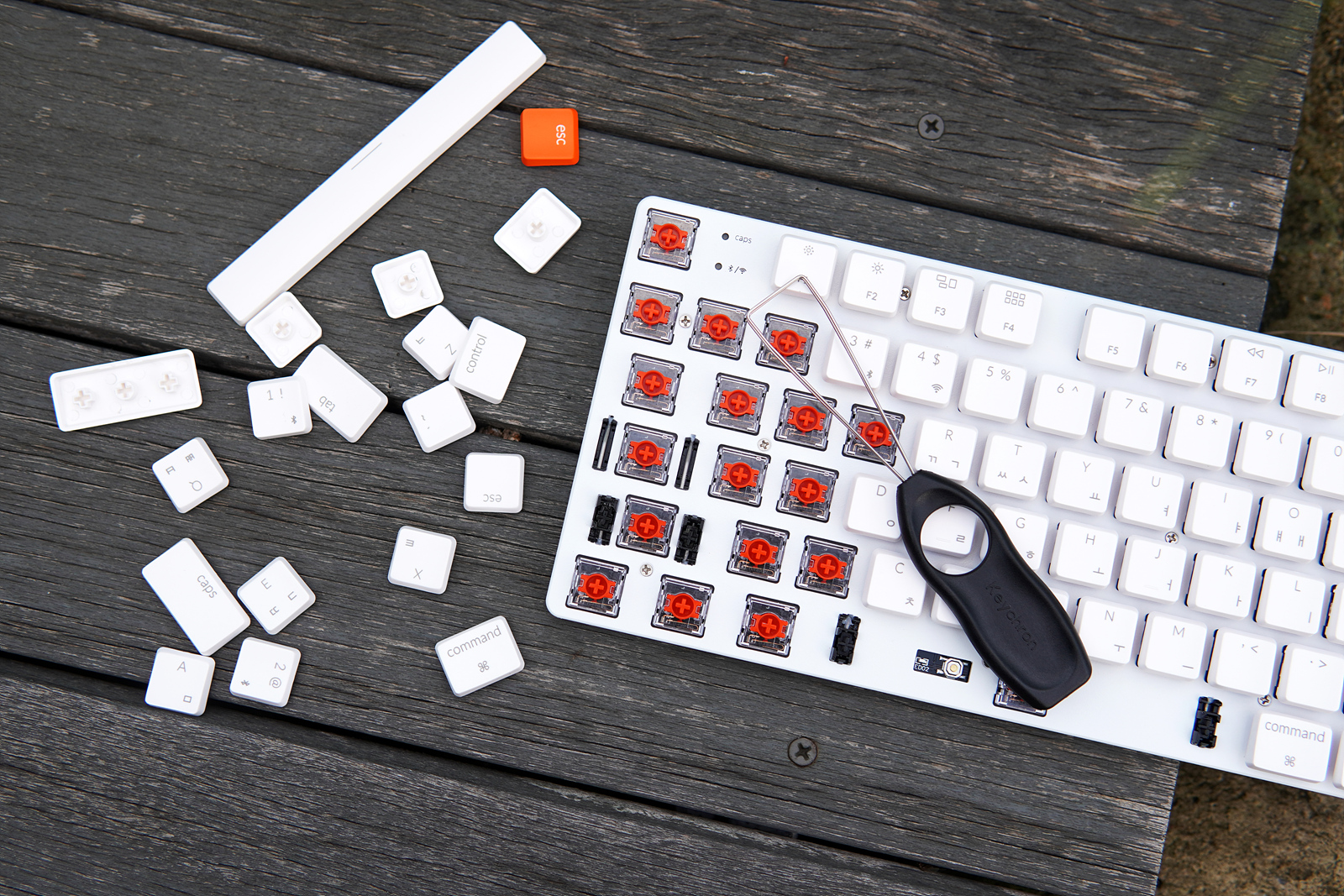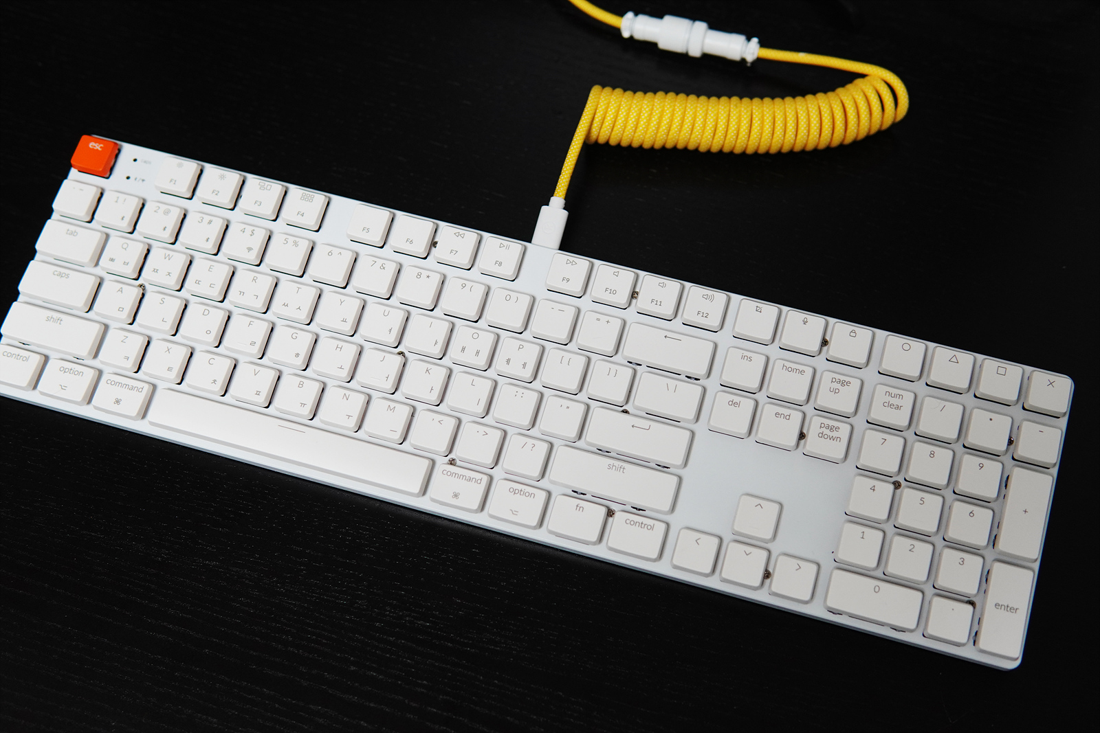 젠더와 C to C 케이블을 사용하면 무선 수신기를 연장할 수 있어서 본체가 책상 아래에 있는 사용자들도 편리하게 사용할 수 있습니다. esc 포인트 키캡은 물론 추가 키캡은 다른 키보드에 비해 조금 더 많이 포함되었습니다.