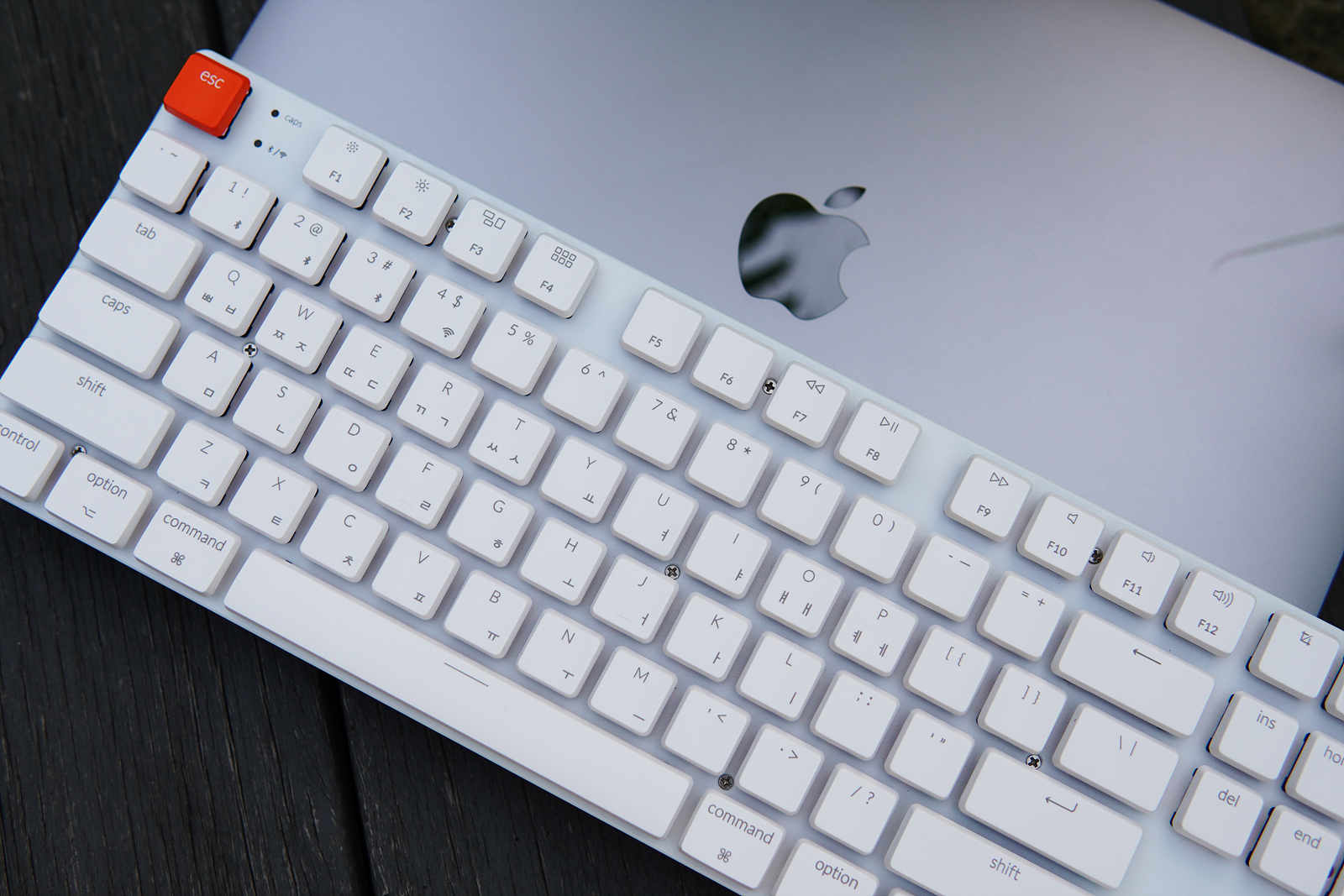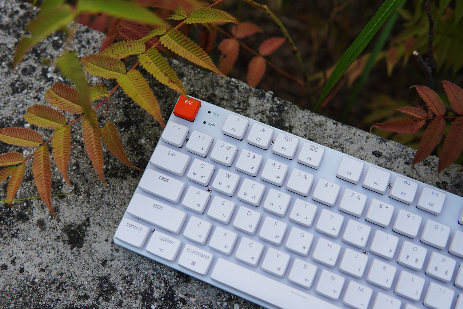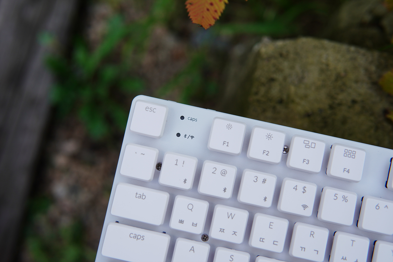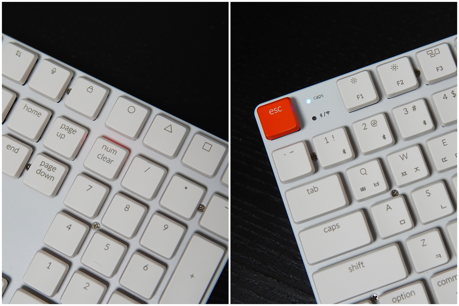 esc 옆으로 Caps Lock, 무선(2.4GHz, 블루투스) 연결을 확인할 수 있는 작은 LED가 있습니다.