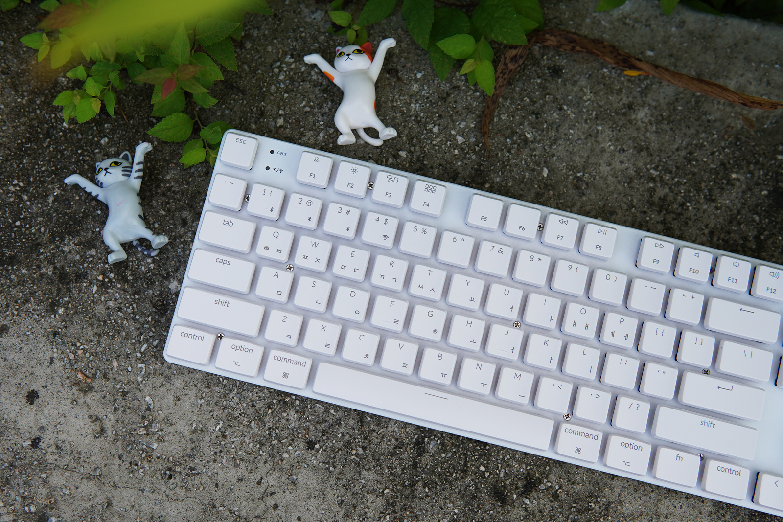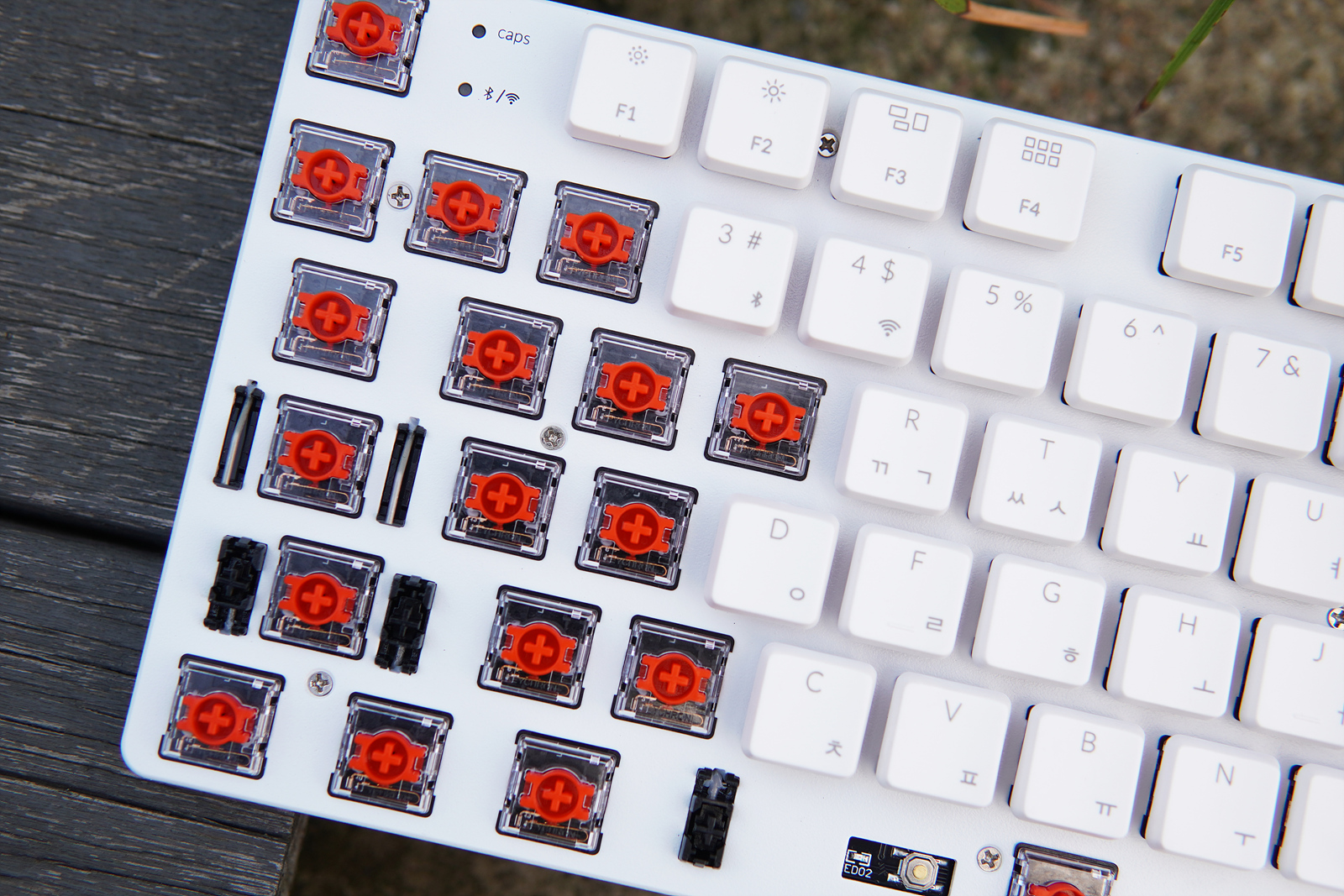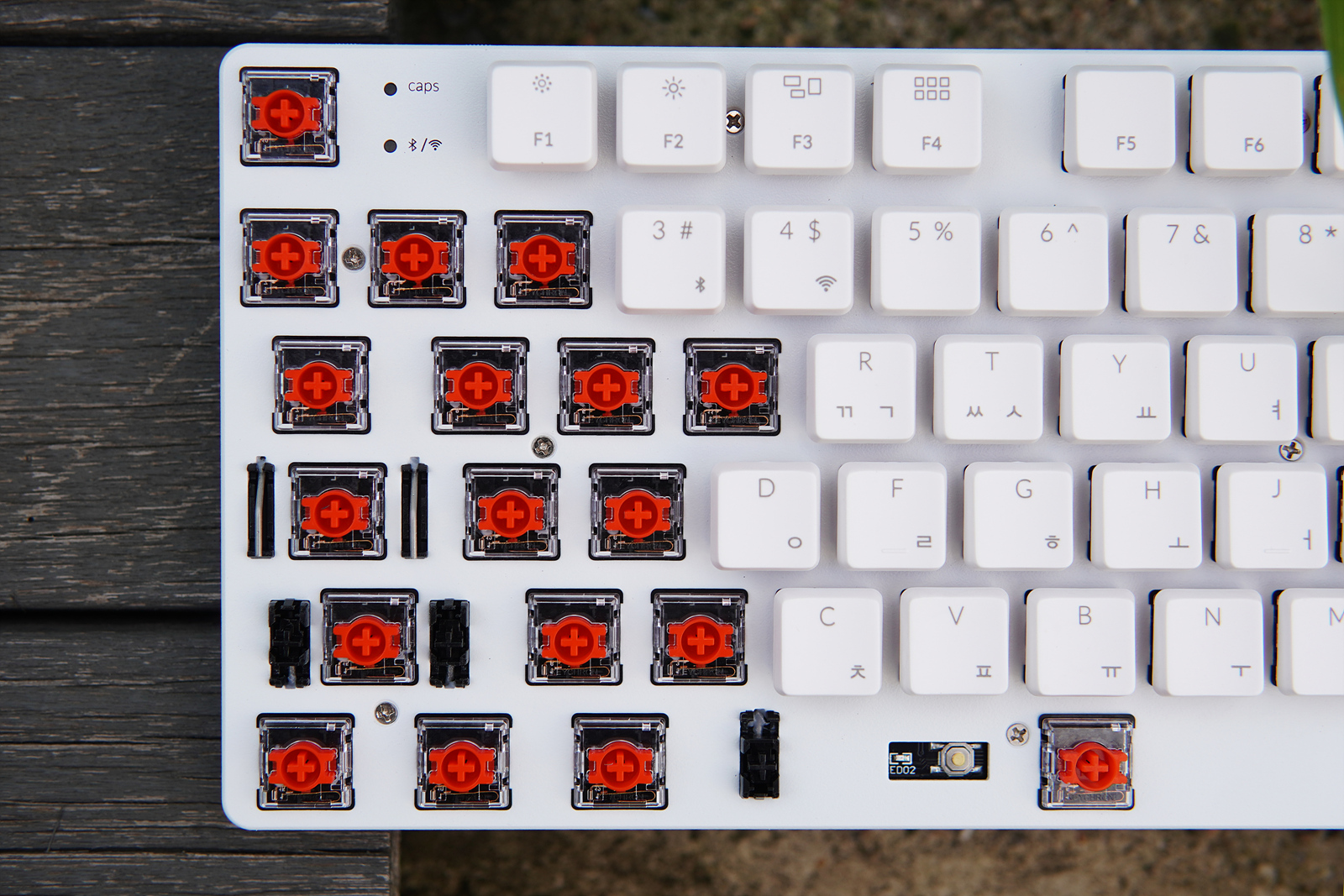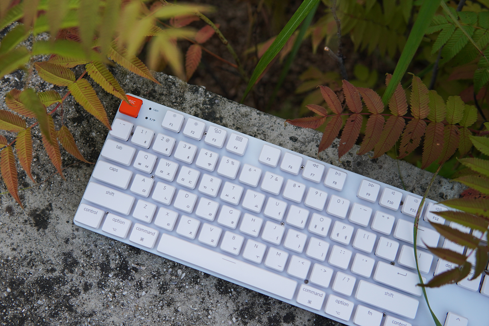 esc 옆으로 Caps Lock, 무선(2.4GHz, 블루투스) 연결을 확인할 수 있는 작은 LED가 있습니다.
