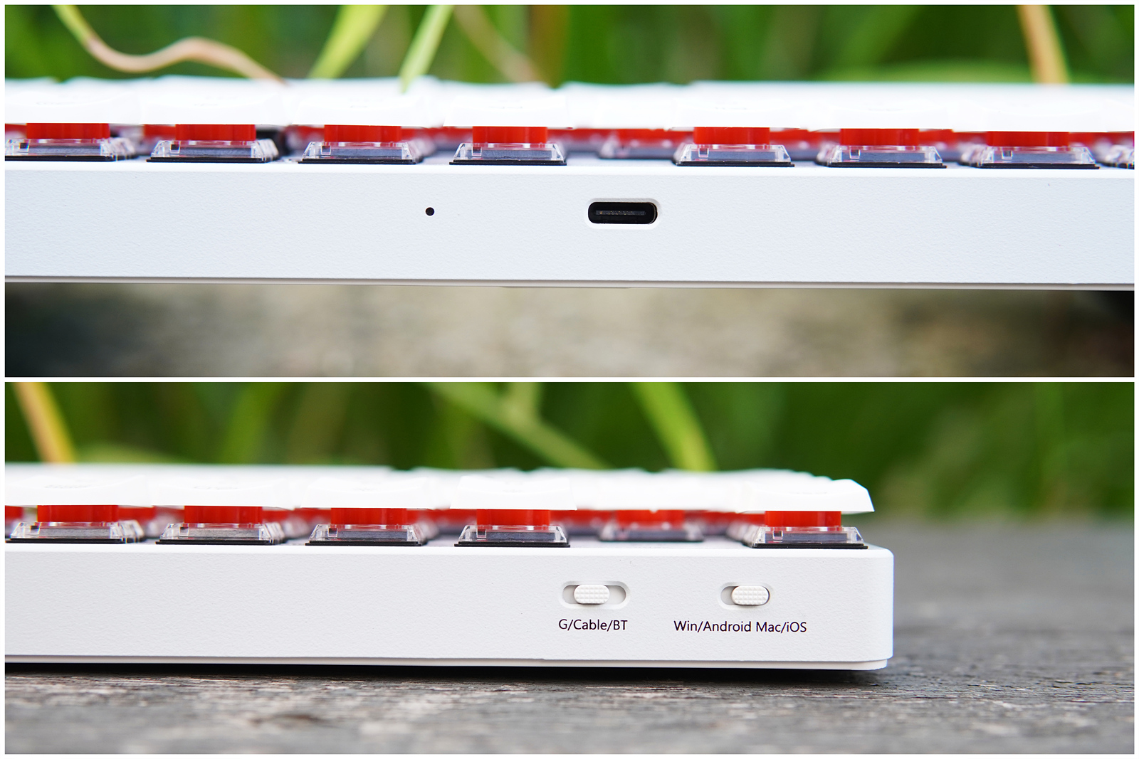 위쪽 측면에는 Ttype-C 커넥터와 연결 모드(무선 / 유선 / 블루투스), OS 선택(Win / Mac) 버튼이 있습니다.