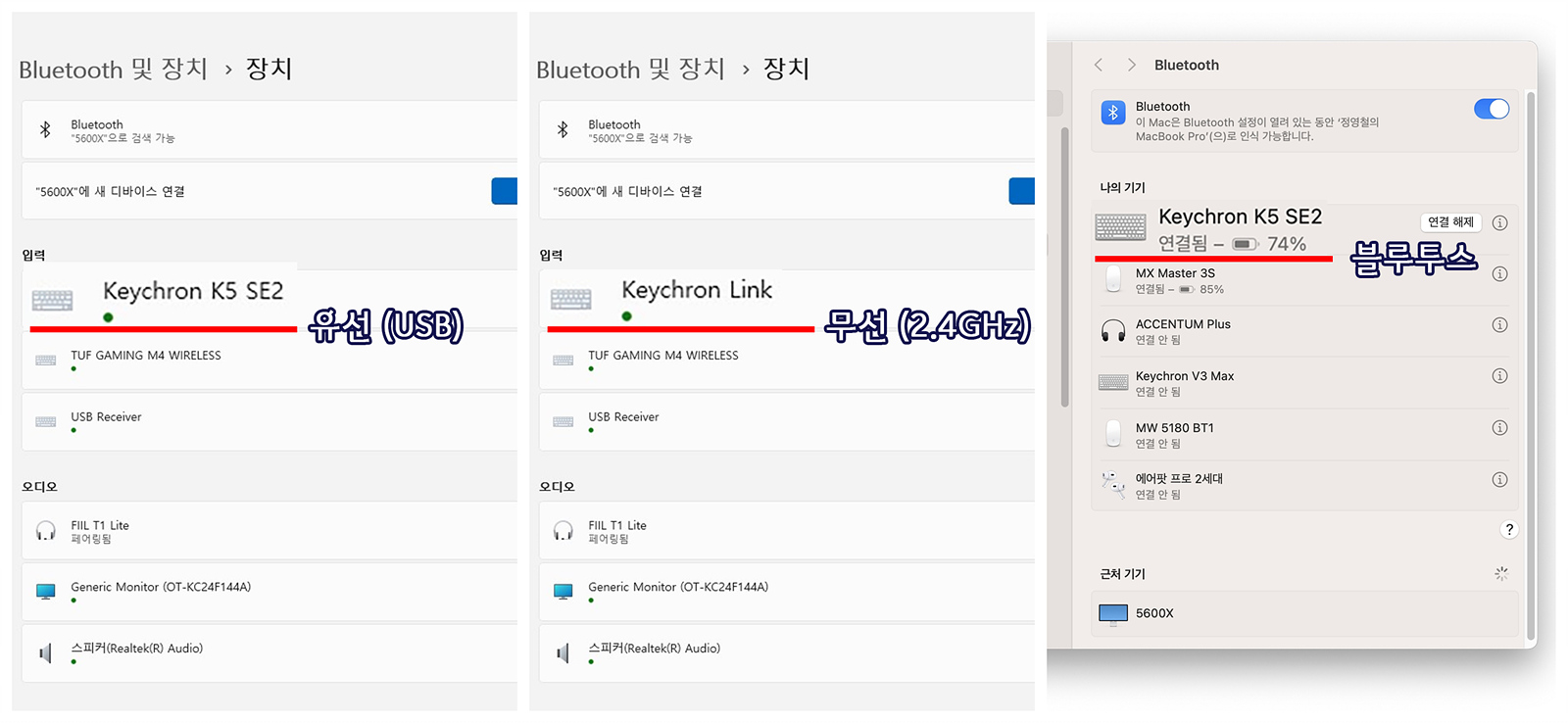 K5 SE2로 오면서 유선과 블루투스에 추가로 2.4GHz 무선을 사용할 수 있는 수신기(동글)가 추가되었으며 각각의 모드에 따라 키보드의 이름은 조금씩 달라지게 됩니다.
