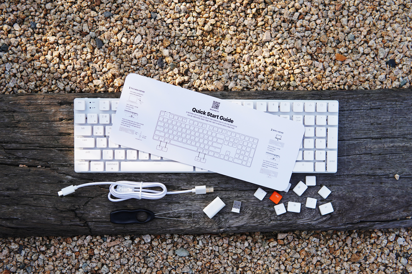 젠더와 C to C 케이블을 사용하면 무선 수신기를 연장할 수 있어서 본체가 책상 아래에 있는 사용자들도 편리하게 사용할 수 있습니다. esc 포인트 키캡은 물론 추가 키캡은 다른 키보드에 비해 조금 더 많이 포함되었습니다.