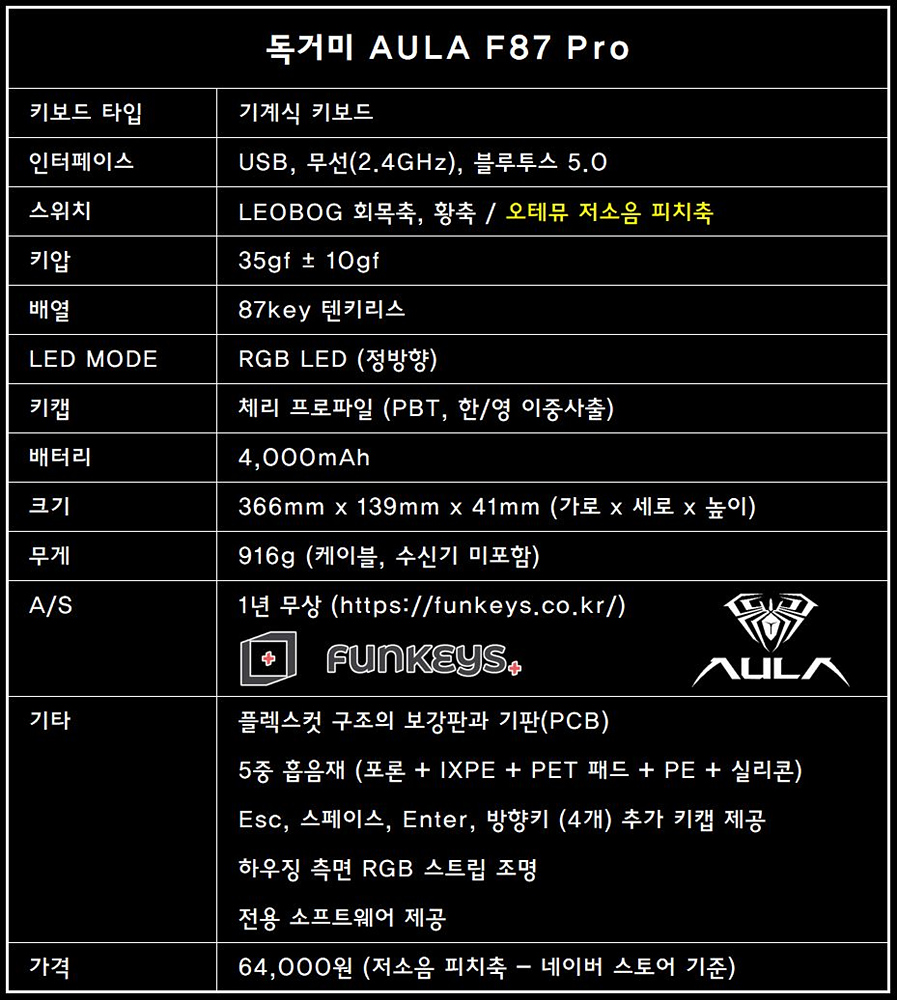AULA F87 Pro 독거미 유무선 키보드 상세정보 바로 가기