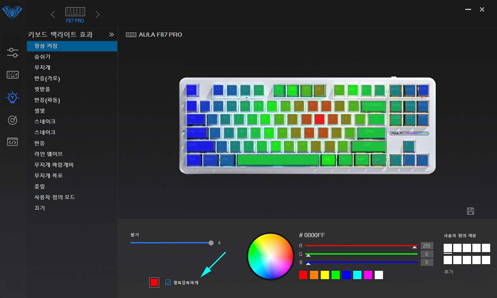 LED는 16개의 모드를 사용할 수 있는데 화면 오른쪽의 디스크모양 아이콘을 눌러야 키보드에 적용됩니다. 화살표 부분의 "알록달록하게"를 체크하면 단색이 아닌 RGB 효과가 적용됩니다.