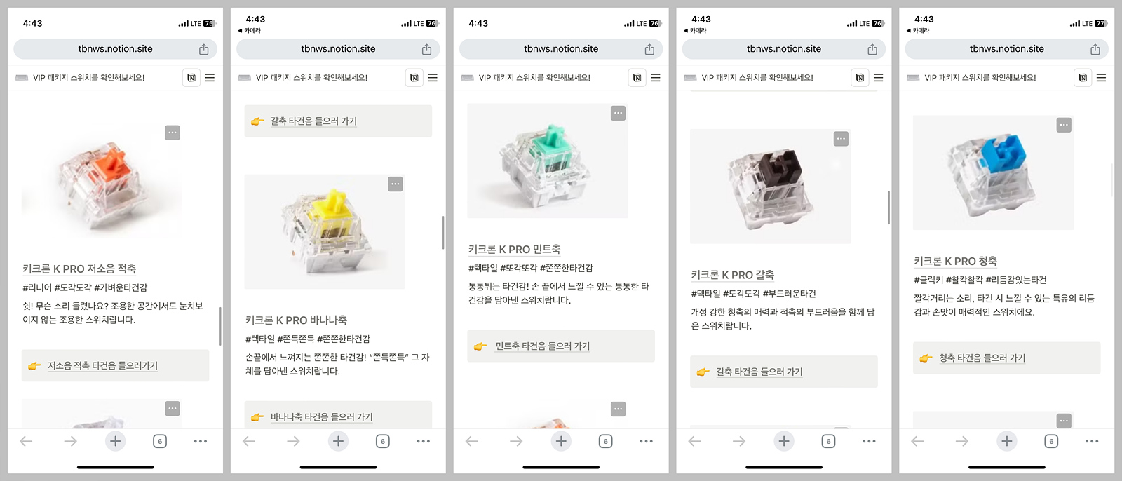 키크론 K PRO 스위치 5종 세트인데 개인적으로 저소음 적축과 바나나축을 강추입니다.