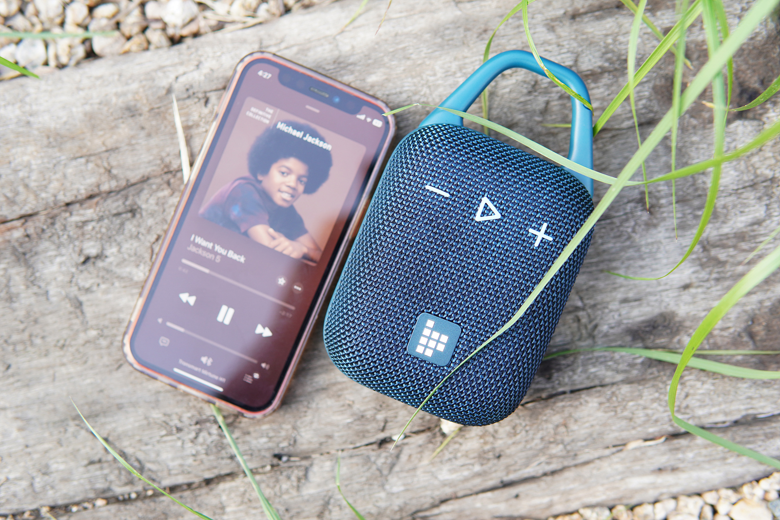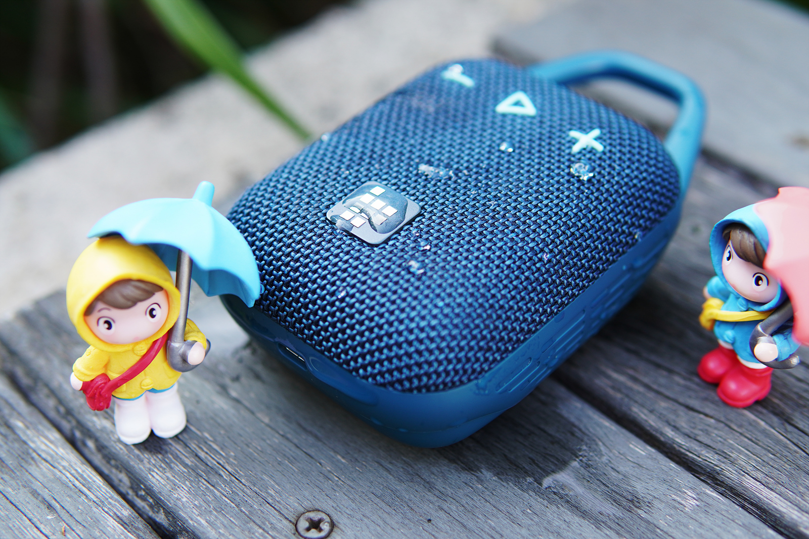 스피커의 외형은 누가 봐도 야외활동(아웃도어)에 최적화되어 있는 모습으로 위쪽에는 카라비너(클립)가 있어서 가방이나 필요한 곳에 편리하게 걸어둘 수 있으며 앞쪽 그릴에는 큼지막한 3개의 물리 버튼이 보입니다. 개인적으로는 터치보다는 물리버튼을 더 좋아하는 편이고 디자인을 해치지 않는 않을 만큼의 크기라서 마음에 들더군요. H1 스피커는 블랙, 블루 두 가지 색이 있는데 소개하는 블루는 파랑보다는 청록색에 조금 더 가까운 모습입니다.