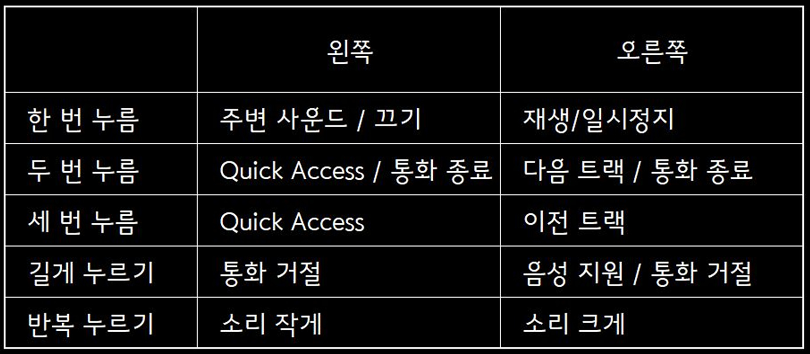 이어버드의 좌우에 따라 기능이 달라지는데 이 중에서 소리를 줄이거나 크게 할 때는 좌우 버튼을 계속 누르면 한 단계씩 조절이 되는 방식으로 다른 이어폰과는 조금 다른 편입니다.