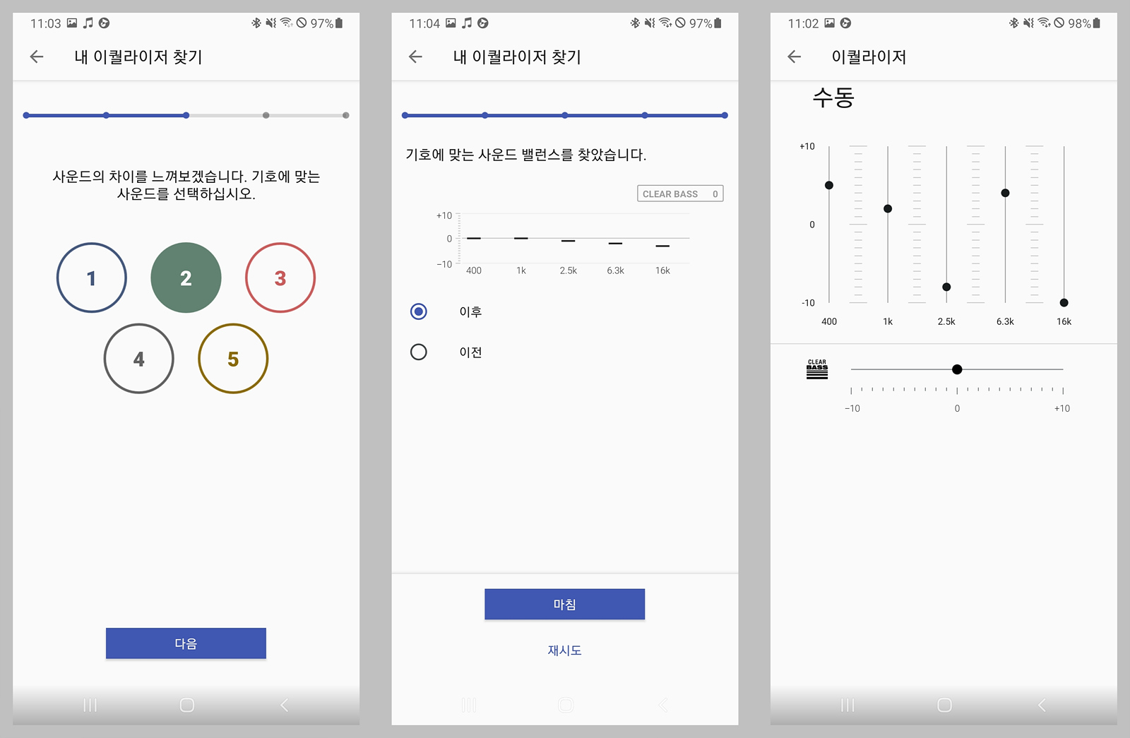 음악을 재생하면서 내가 좋아하는 스타일을 선택하면 자동으로 EQ를 세팅할 수 있으며 이때는 커스텀 2번으로 저장이 됩니다. 수동은 사용자가 임의로 5 밴드를 조절해서 세팅할 수 있습니다.