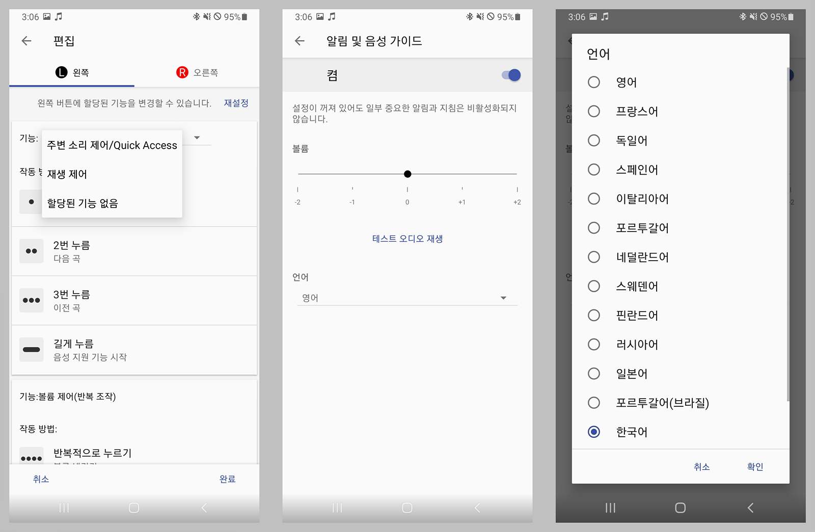 이어버드의 기능은 사용자가 임의로 설정할 수는 없지만 프리셋처럼 좌우 따로 선택할 수 있으며 음성 안내는 소리의 크기와 언어를 선택할 수 있습니다. (언어는 다운로드 후 적용하는 방식으로 시간이 좀 걸립니다.)