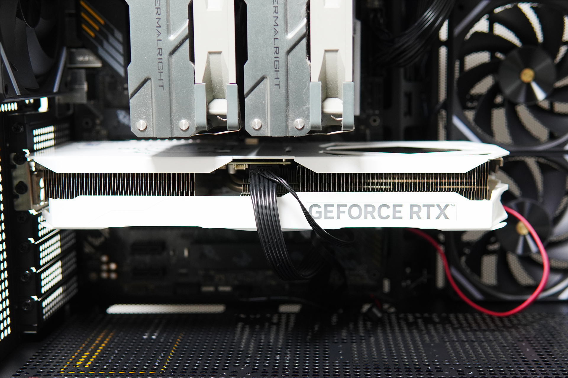 그래픽 카드와 연결되는 케이블은 한눈에 확인할 수 있습니다. 케이블의 경우 커넥터가 꺾이지 않고 90도로 정확하게 끝까지 결착되는 게 중요하니 꼭 기억하시기 바랍니다.