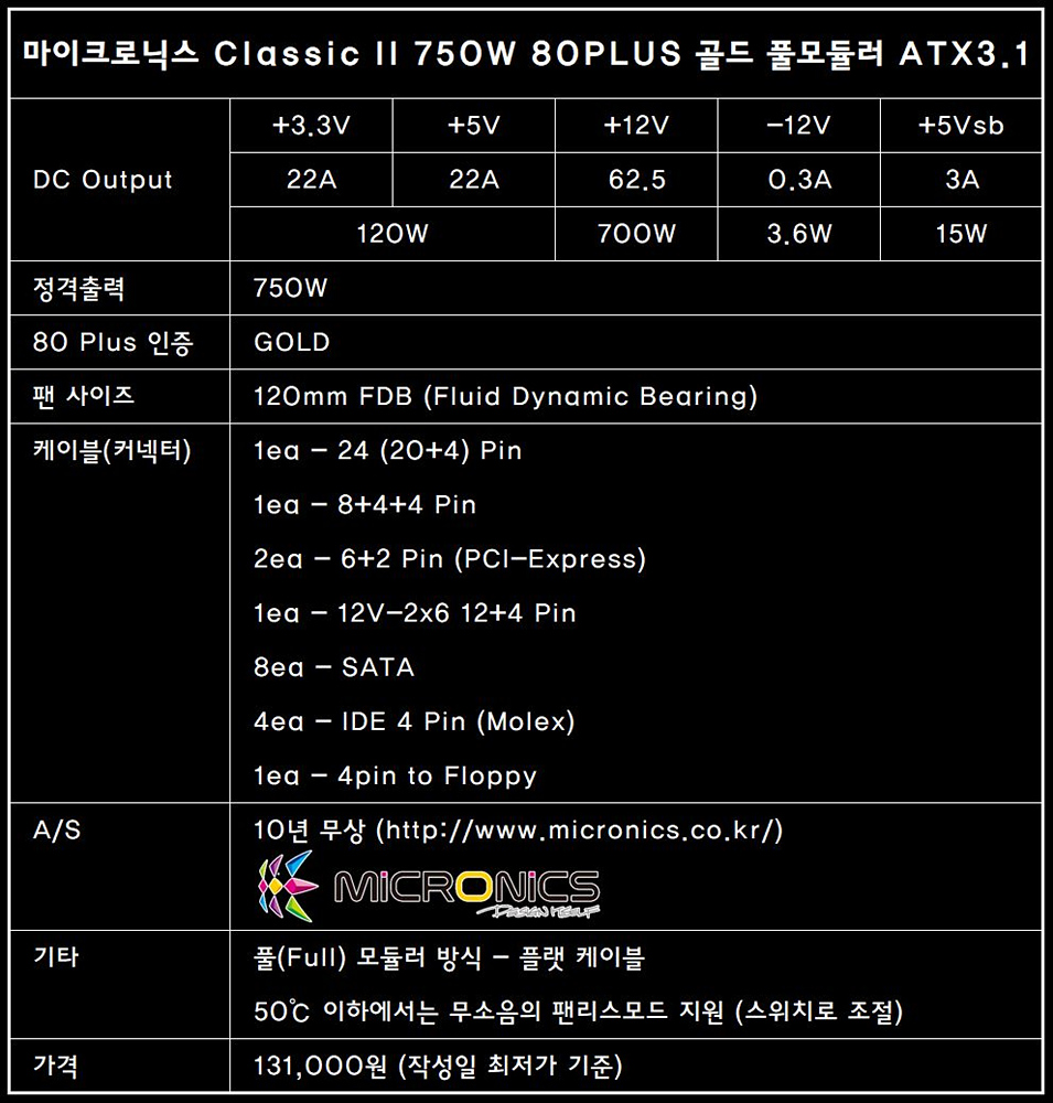 마이크로닉스 Classic II 750W 80PLUS골드 풀모듈러 ATX3.1 상세정보 바로 가기