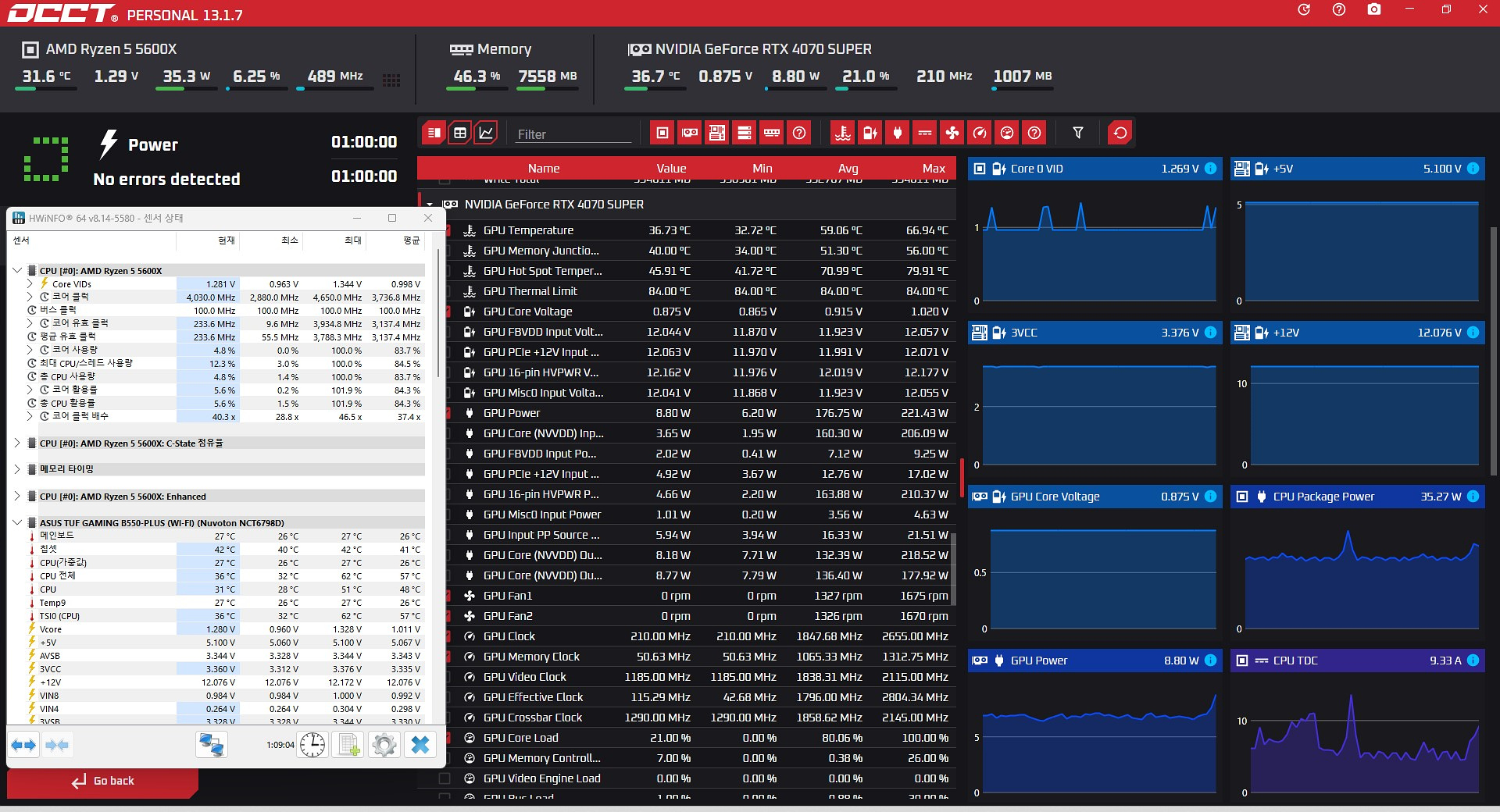 테스트를 진행한 시스템은 5600X & 4070 Super입니다. 아마도 일반 사용자들이라면 750W, 850W를 가장 많이 구입할 테고 이 정도 출력이라면 CPU에 따라 조금 달라지겠지만 4070, 4080 79000XT까지는 무리 없이 사용할 수 있는 수준입니다. 4090이나 향후에도 5090을 계획한다면 여유 있게 1k 이상으로 구입하는 걸 추천합니다.