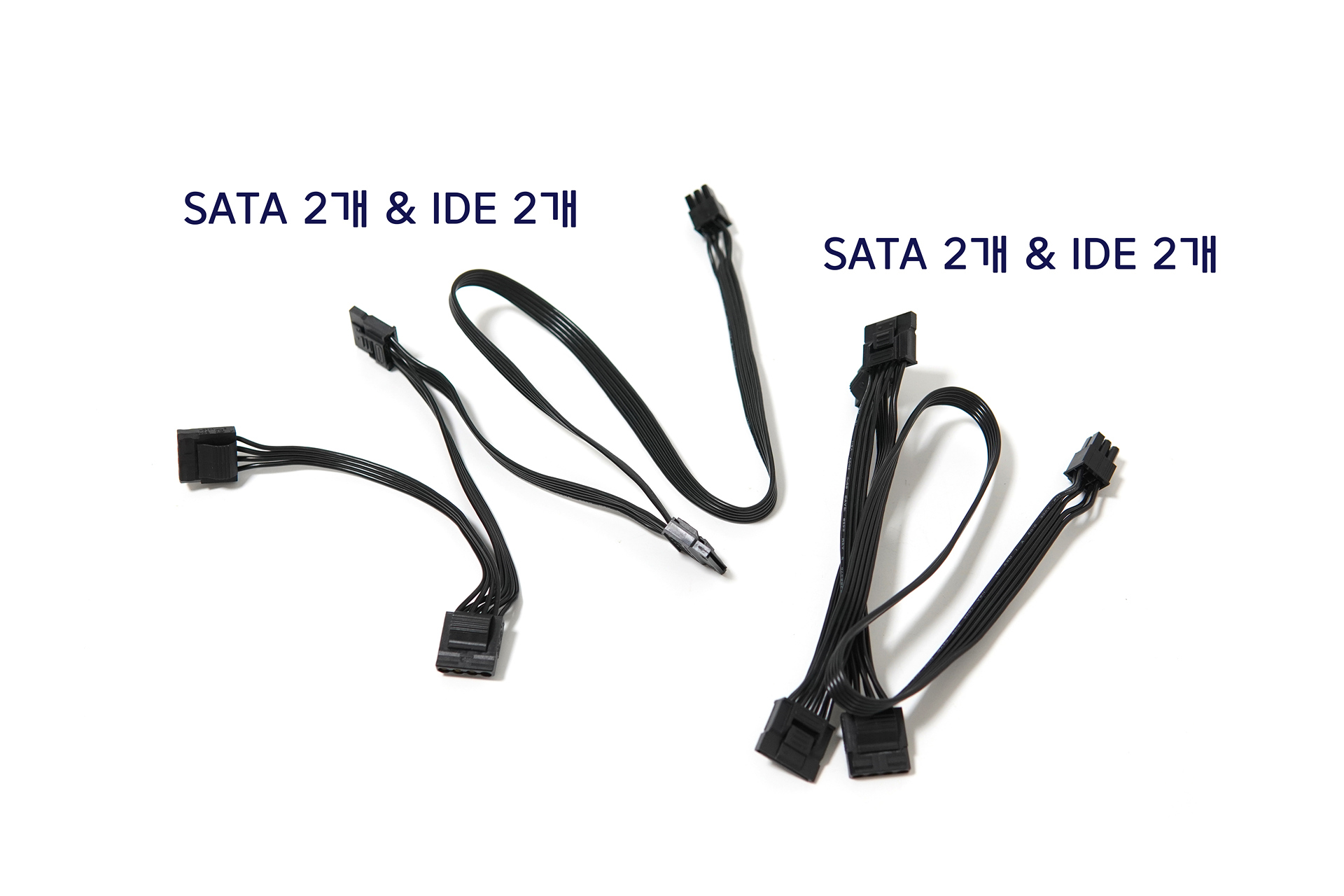 SATA 커넥터와 IDE(Molex 4핀) 커넥터가 각각 두 개씩 있는 케이블이 두 쌍이 포함되어 있습니다. (총 8개) 요즘은 IDE 커넥터를 사용하는 경우가 많지 않지만 가끔씩 주변 기기에서 사용하다 보니 꼭 필요한 케이블입니다.
