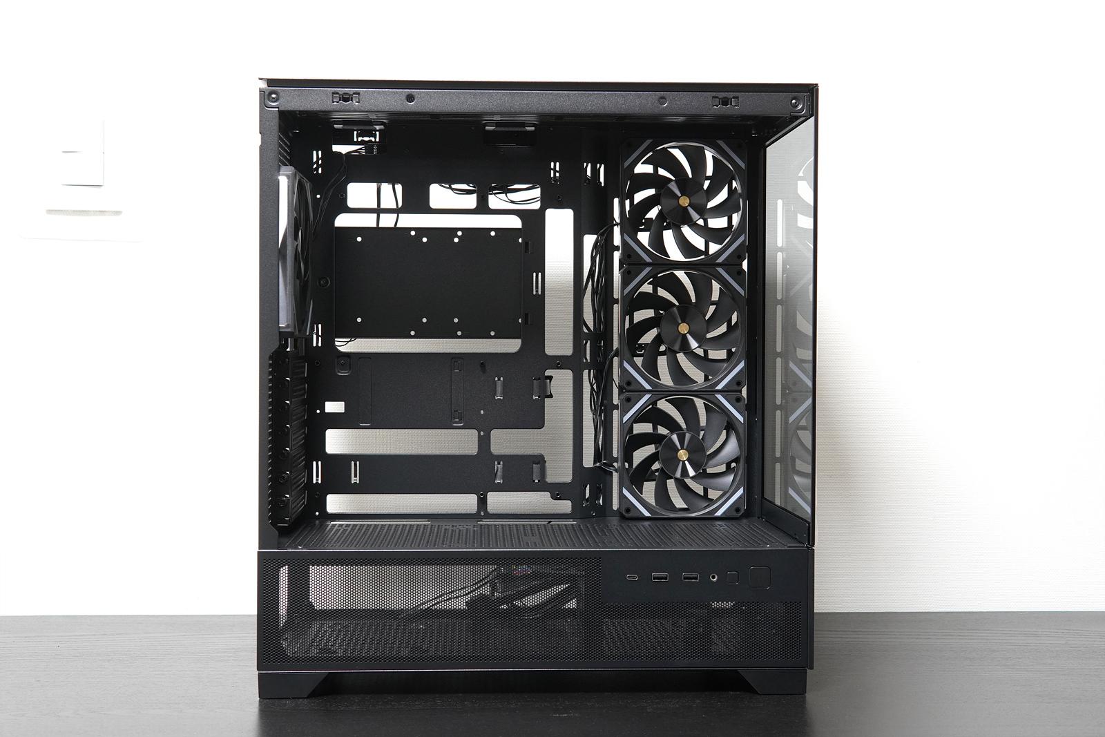 전원, RGB, USB 포트는 케이스의 위쪽이 아닌 측면에 자리 잡고 있는데 책상 위에 케이스를 놓고 사용하는 분들에게는 딱 맞는 위치라고 할 수 있지만 바닥에 놓고 사용하는 분들이라면 다소 불편할 수 있겠죠. 이 부분은 사용하는 환경에 따라 호볼호가 나뉠 거라 생각합니다.