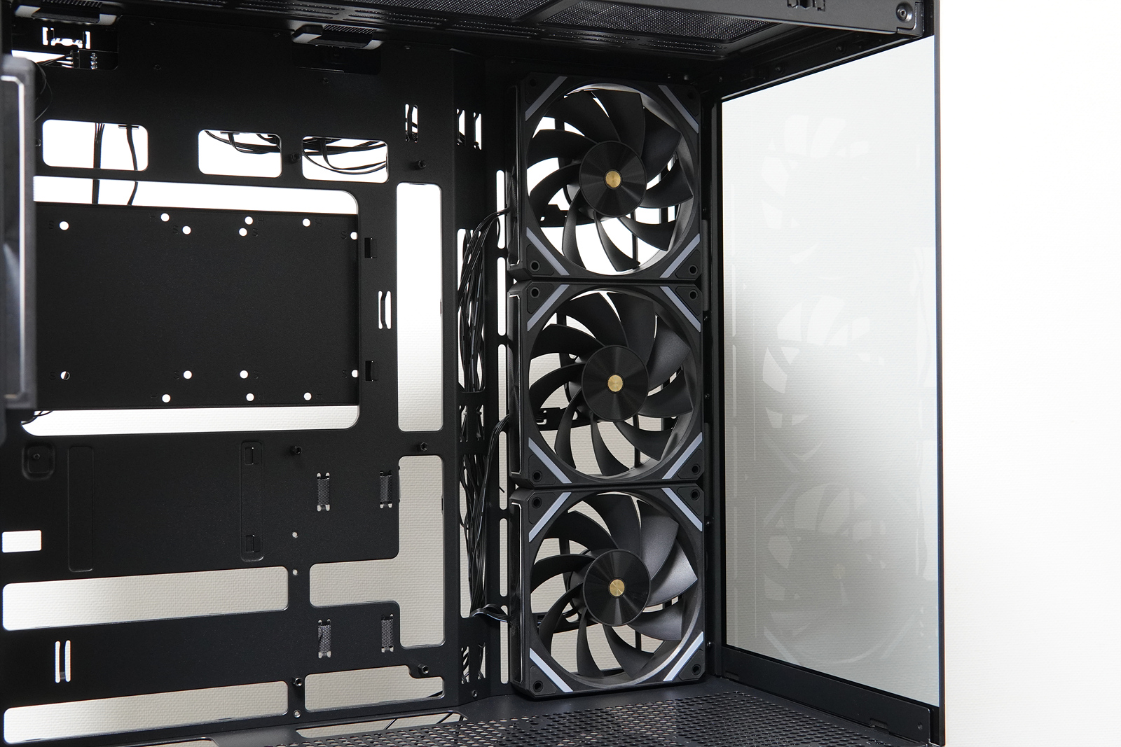 BTF가 지원되지 않는 일반 메인보드나 VGA의 케이블을 정리할 수 있는 홀(hole)은 적재적소에 배치되어 있는데 별도의 고무마개가 없는 부분은 살짝 아쉽더군요. (아주 고가의 케이스는 아니지만 그래도 10만 원 정도라면 사용자들의 기대도 좀 높아질 테니까요.)