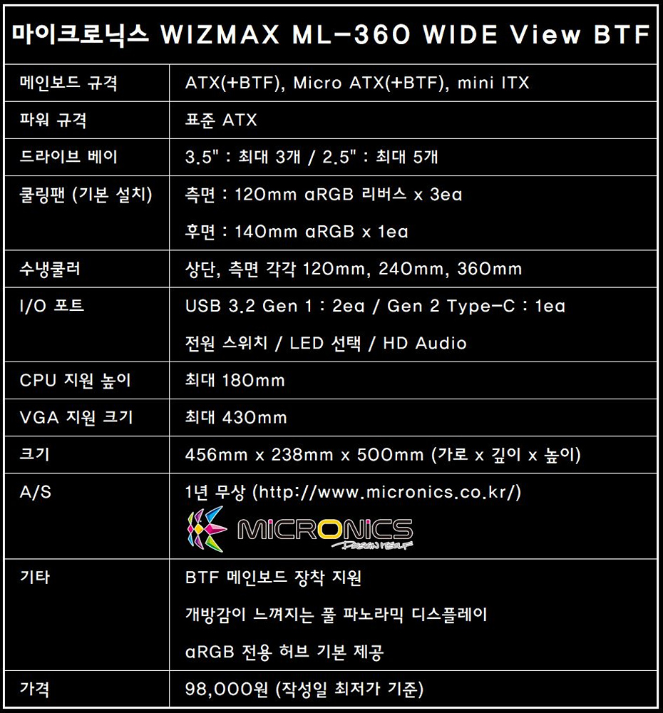 마이크로닉스 WIZMAX ML-360 WIDE View BTF 케이스 상세정보 바로 가기