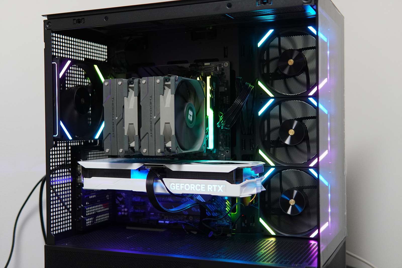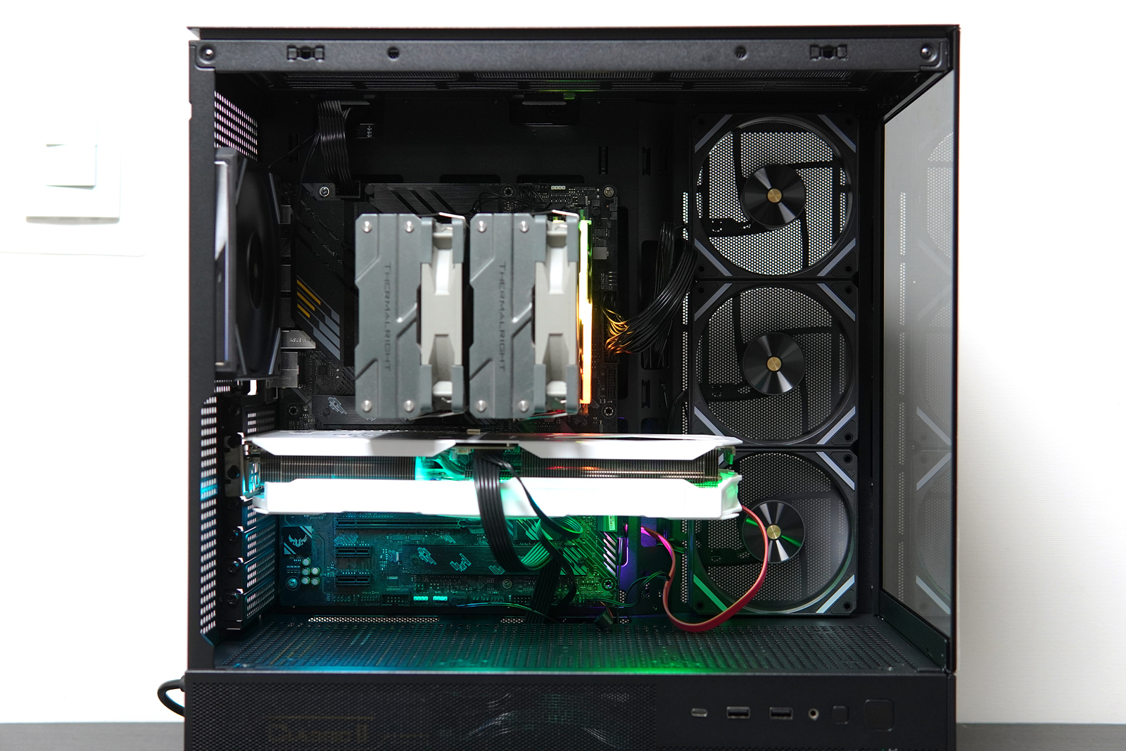 BTF가 아닌 일반적인 메인보드였음에도 선정리에 어려움이 없었으며 시간도 짧아서 뭐 빼먹은 게 있나?라는 생각이 들 정도였습니다. 3 팬의 그래픽 카드도 아주 무난하게 장착할 수 있었으며 CPU 쿨러는 최대 180mm까지 사용할 수 있어서 대장급 공랭도 사용할 수 있습니다. 이 케이스를 사용한다면 그래픽카드나 CPU 쿨러의 크기(길이, 높이)때문에 걱정하거나 스트레스 받을 일은 없을겁니다.
