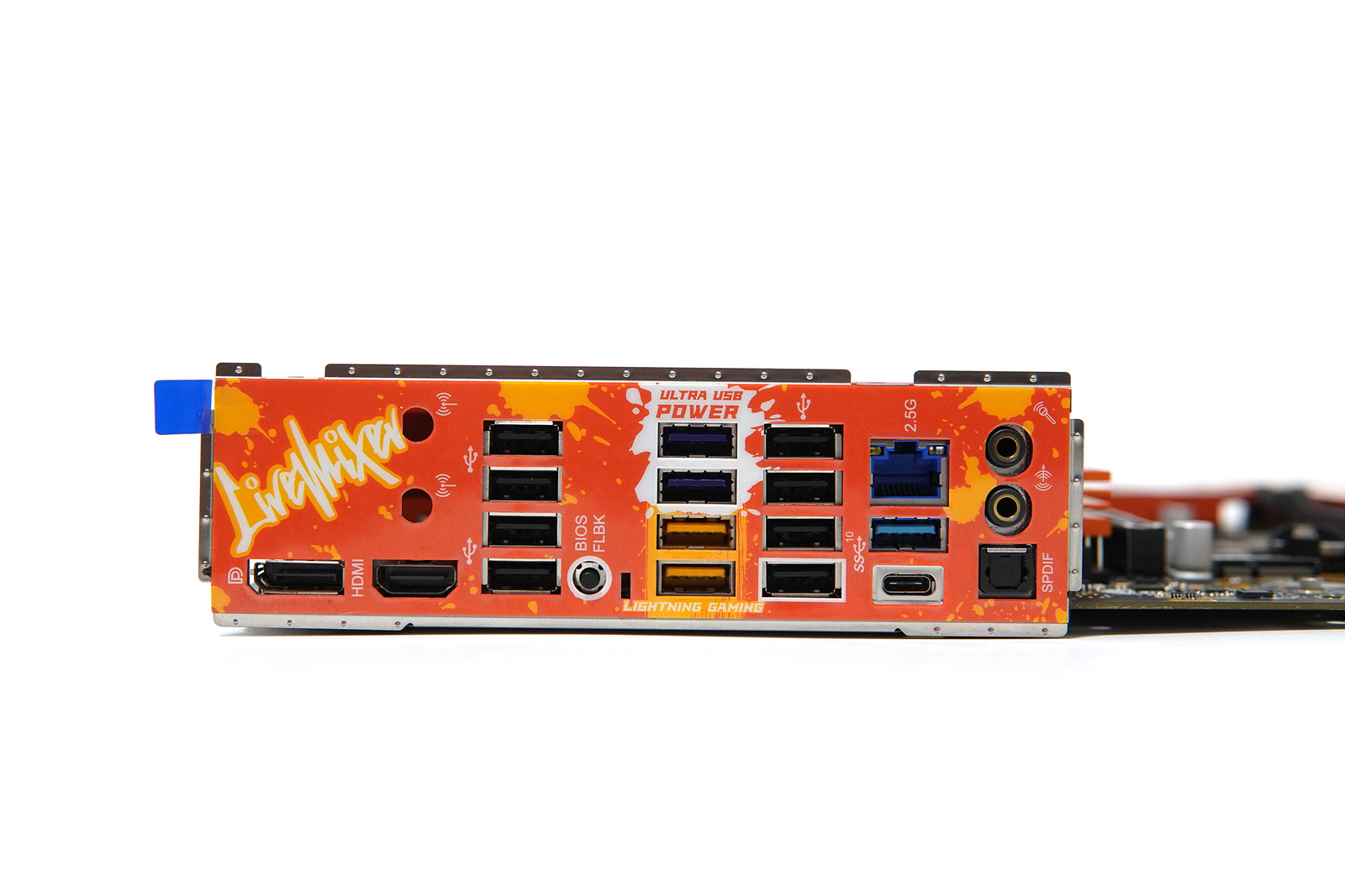 LiveMixer(라이브믹서)라는 이름처럼 백패널에는 다양한 멀티미디어 기기를 연결하기 위한 USB 포트가 상당히 많습니다. 추가로 내부에는 썬더볼트 핀 헤더도 있습니다.
