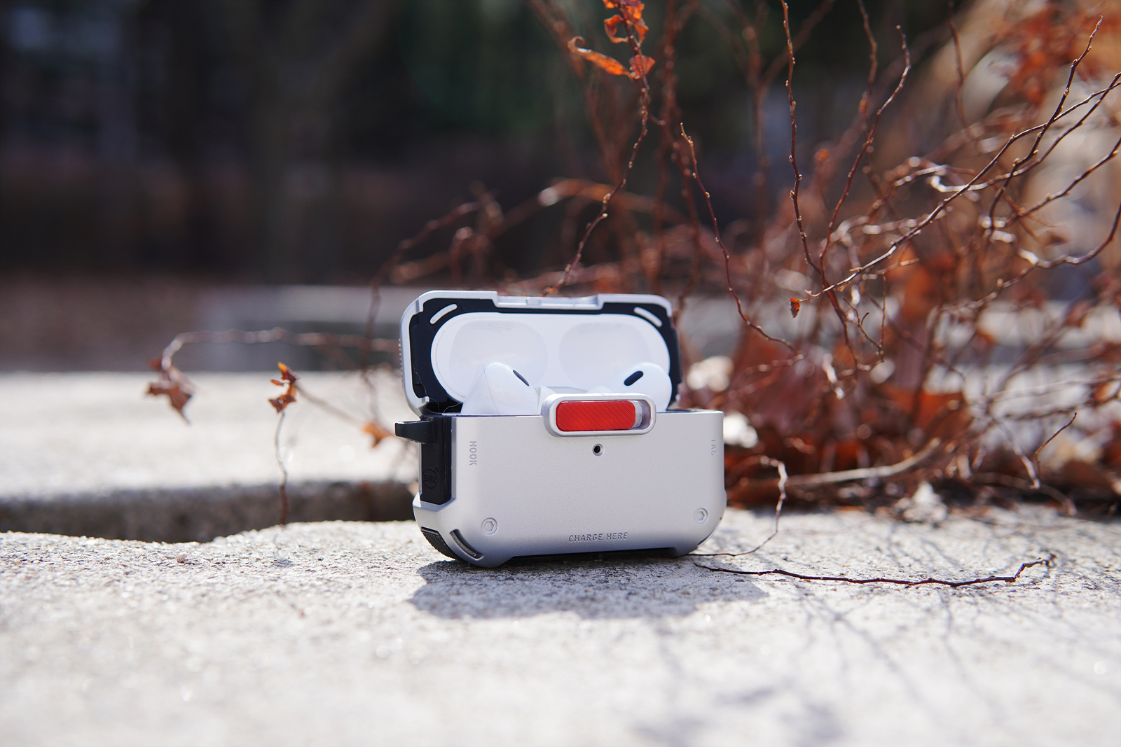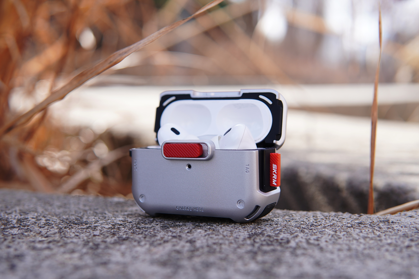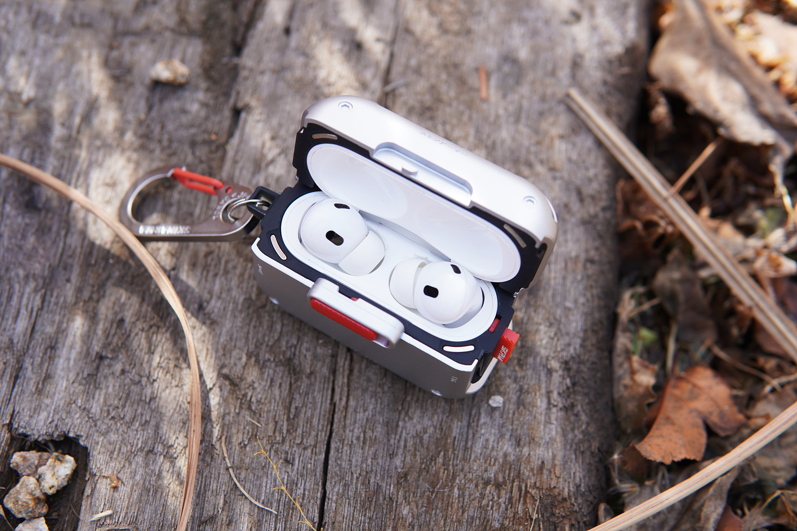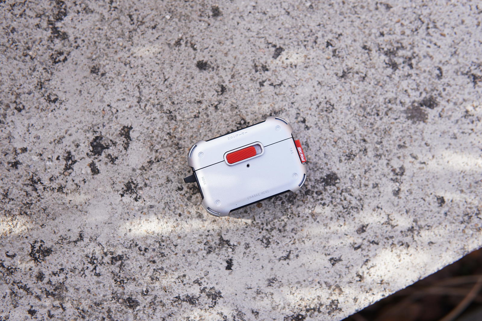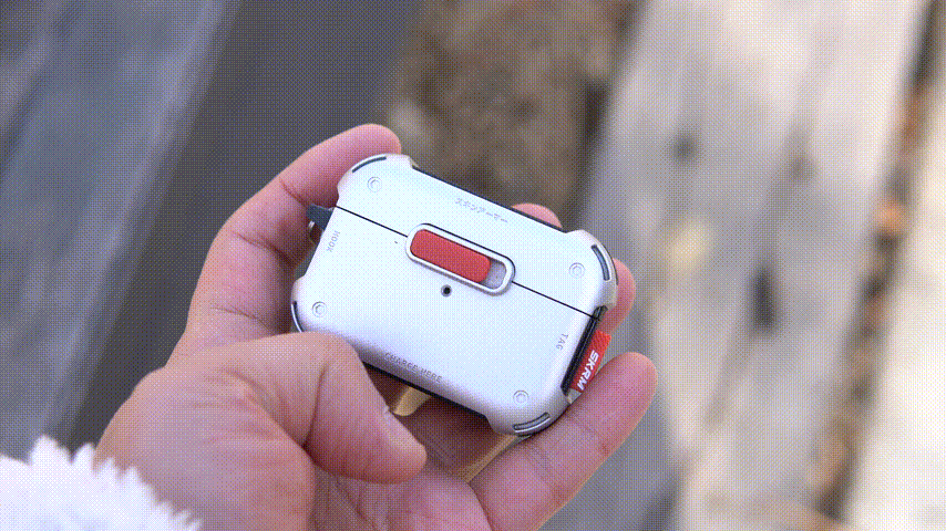 메카 케이스의 기능적인 특징이라면 사진에 보이는 빨간색 버튼인데 케이스를 닫게 되면 저 슬라이드 버튼을 누르지 않는 한 절대 열리지 않습니다. 에어팟 프로 2의 케이스도 자성 때문에 쉽게 열리는 편은 아니지만 가방에 넣어서 다니면 가끔씩은 뚜껑이 열리는 경우가 있었는데 스키나미 메카 케이스를 사용하면 이런 사고를 완전히 막을 수 있습니다. 슬라이드 방식으로 고정을 하다 보니 닫을 때 조금 강하게 힘을 주어서 사용을 해야 된다는 단점(?)이 있을 수 있겠지만 개인적으로 확실히 고정이 되는 부분이 오히려 더 좋았습니다.