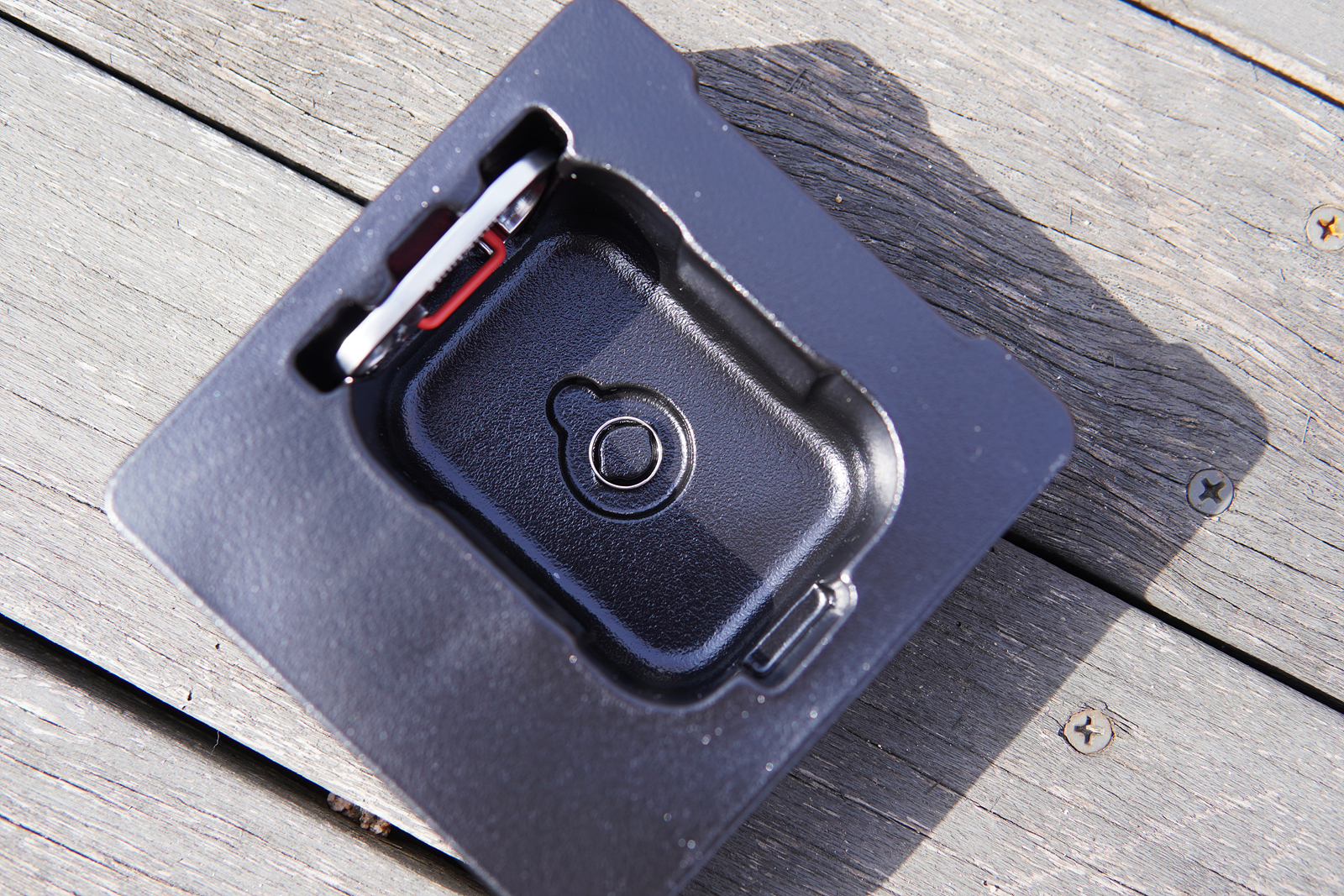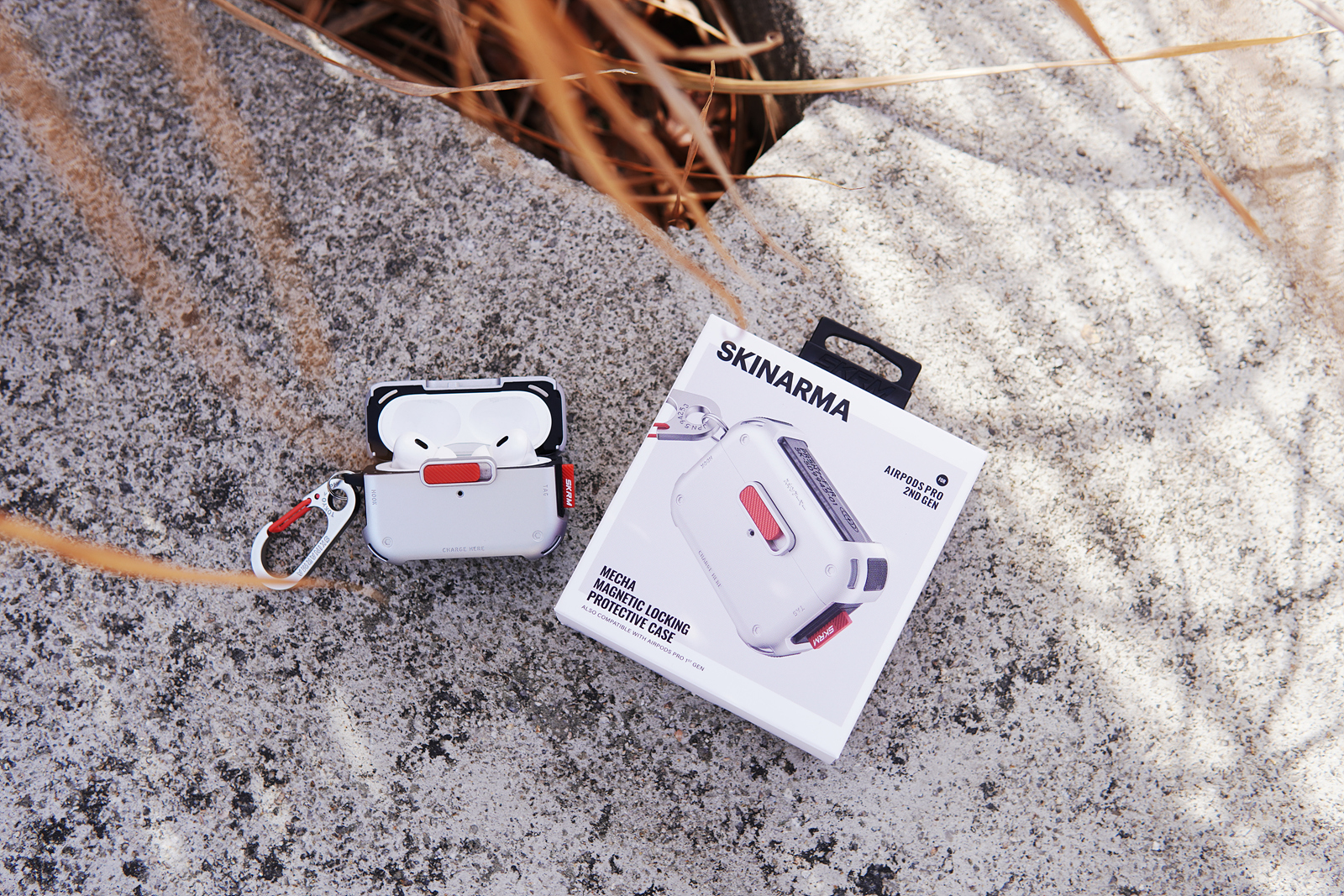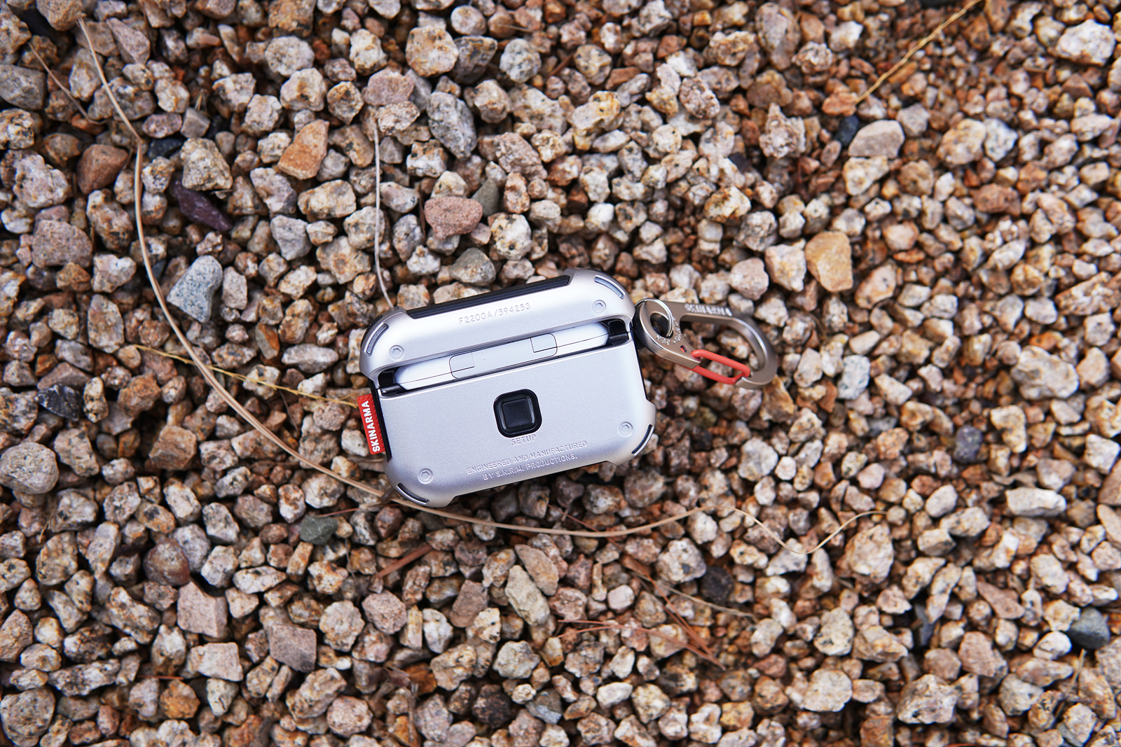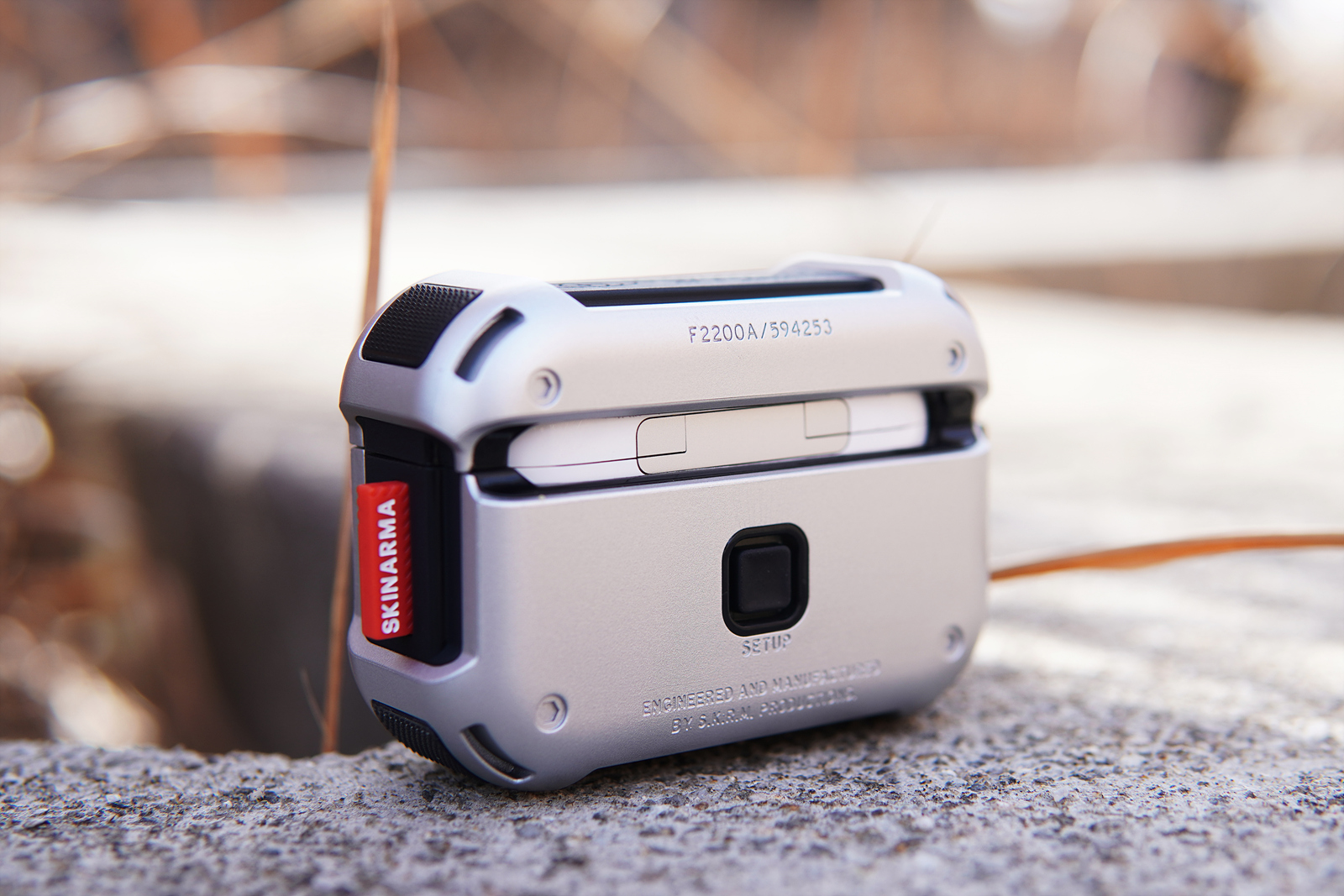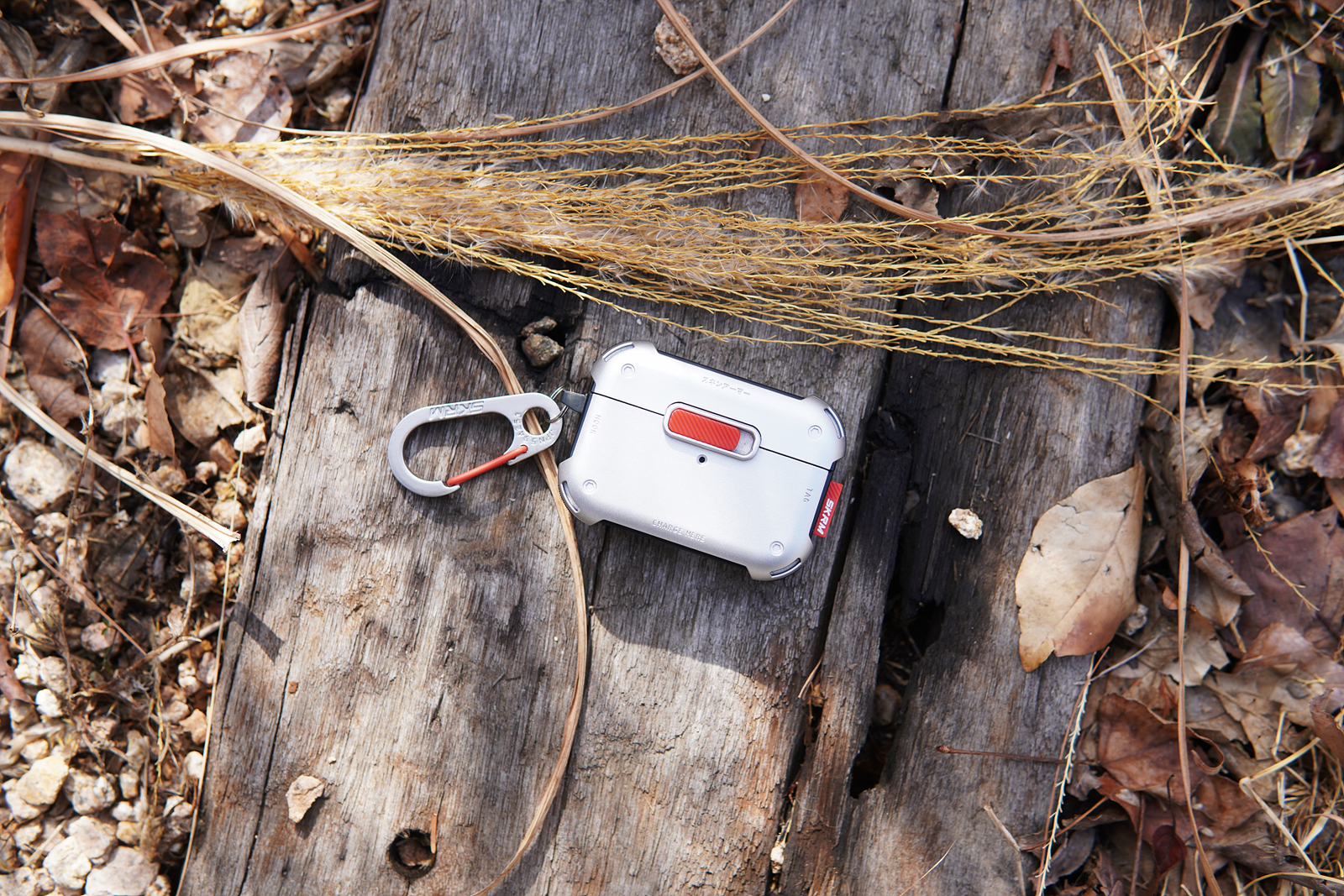 메카 케이스의 기능적인 특징이라면 사진에 보이는 빨간색 버튼인데 케이스를 닫게 되면 저 슬라이드 버튼을 누르지 않는 한 절대 열리지 않습니다. 에어팟 프로 2의 케이스도 자성 때문에 쉽게 열리는 편은 아니지만 가방에 넣어서 다니면 가끔씩은 뚜껑이 열리는 경우가 있었는데 스키나미 메카 케이스를 사용하면 이런 사고를 완전히 막을 수 있습니다. 슬라이드 방식으로 고정을 하다 보니 닫을 때 조금 강하게 힘을 주어서 사용을 해야 된다는 단점(?)이 있을 수 있겠지만 개인적으로 확실히 고정이 되는 부분이 오히려 더 좋았습니다.