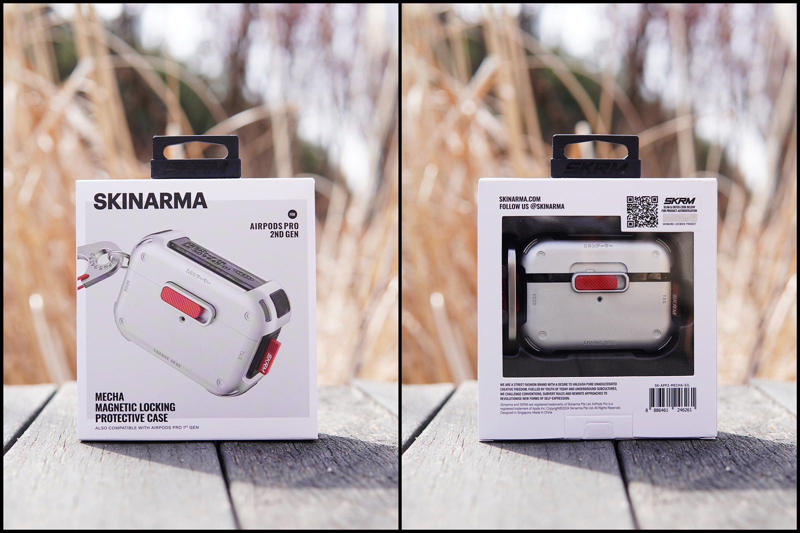 제품의 이름은 "스키나마 메카 에어팟 프로 2 슬라이드 락 케이스"로 조금 긴 편이지만 줄여서 스키나마 메카 혹은 메카로 부르면 될 거 같네요. 박스는 실물을 확인할 수 있는 구조로 되어있으며 크롬 / 프로스트 / 건메탈 / 스모크 / 티타늄 5가지의 색으로 선택의 폭이 넓은 편입니다. (제가 소개하는 제품은 크롬입니다.)