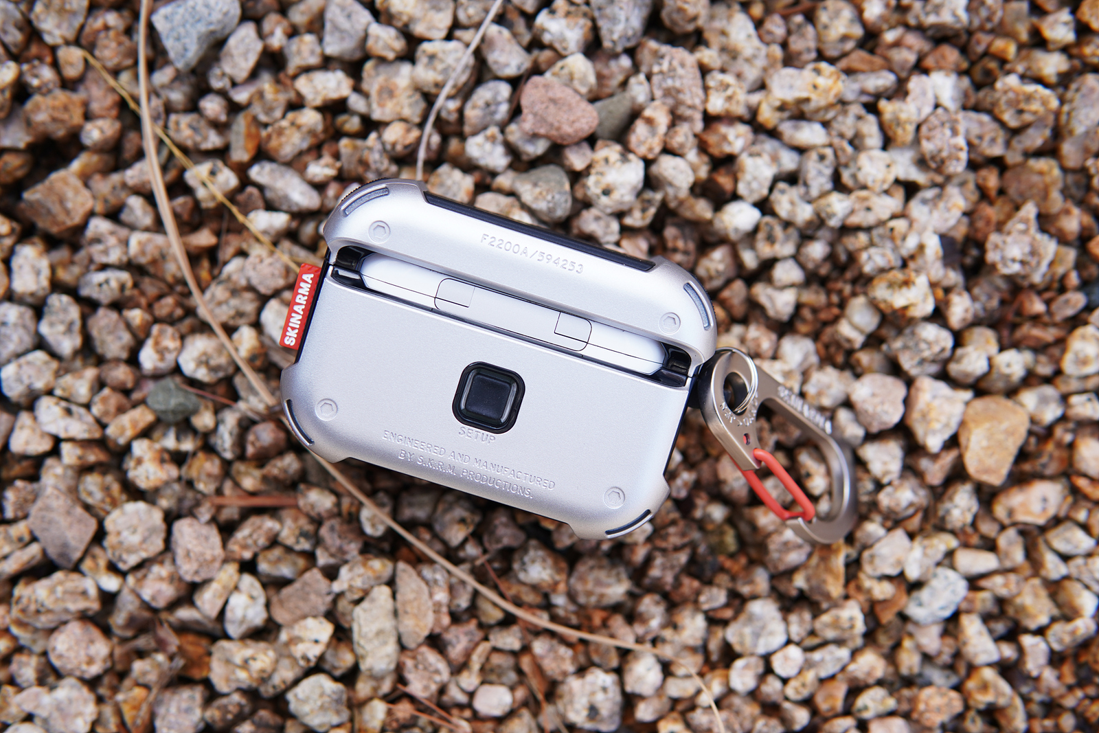 케이스는 TPU + PC 재질로 되어있고 본체와 뚜껑이 각각 분리가 되어 편리하게 장착할 수 있습니다. 카라비너는 메탈 재질인데 두께가 있어서인지 제법 묵직하고 고리 부분 역시 상당히 튼튼합니다. 에어팟에 장착해서 사용하면서 카라비너가 휘거나 망가지는 일은 없을 거 같습니다.