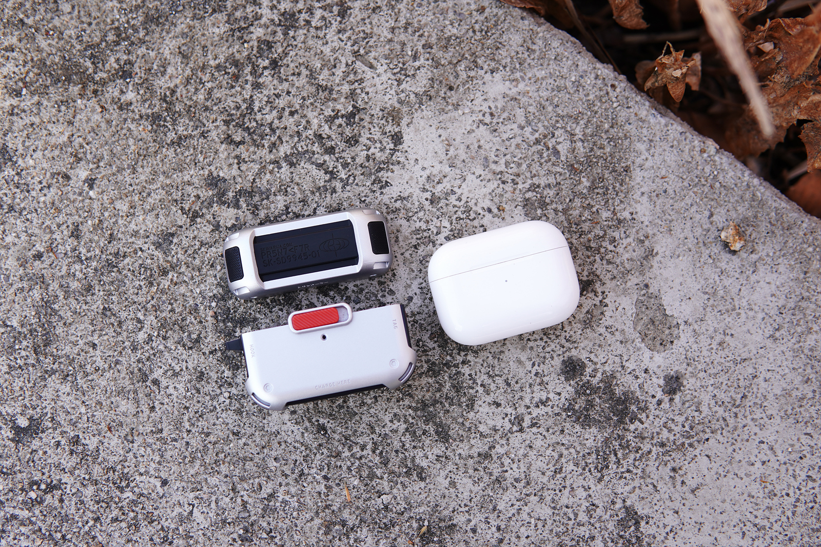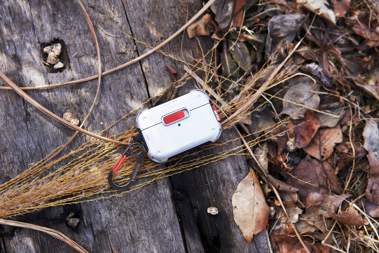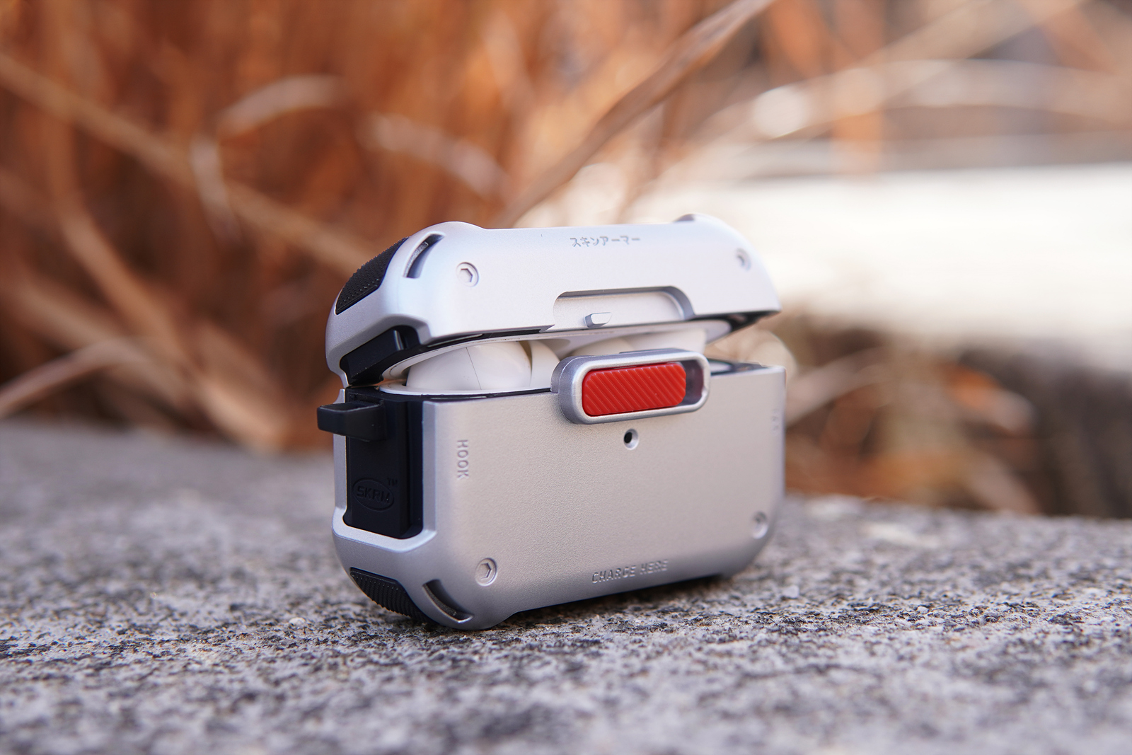 메카 케이스의 기능적인 특징이라면 사진에 보이는 빨간색 버튼인데 케이스를 닫게 되면 저 슬라이드 버튼을 누르지 않는 한 절대 열리지 않습니다. 에어팟 프로 2의 케이스도 자성 때문에 쉽게 열리는 편은 아니지만 가방에 넣어서 다니면 가끔씩은 뚜껑이 열리는 경우가 있었는데 스키나미 메카 케이스를 사용하면 이런 사고를 완전히 막을 수 있습니다. 슬라이드 방식으로 고정을 하다 보니 닫을 때 조금 강하게 힘을 주어서 사용을 해야 된다는 단점(?)이 있을 수 있겠지만 개인적으로 확실히 고정이 되는 부분이 오히려 더 좋았습니다.