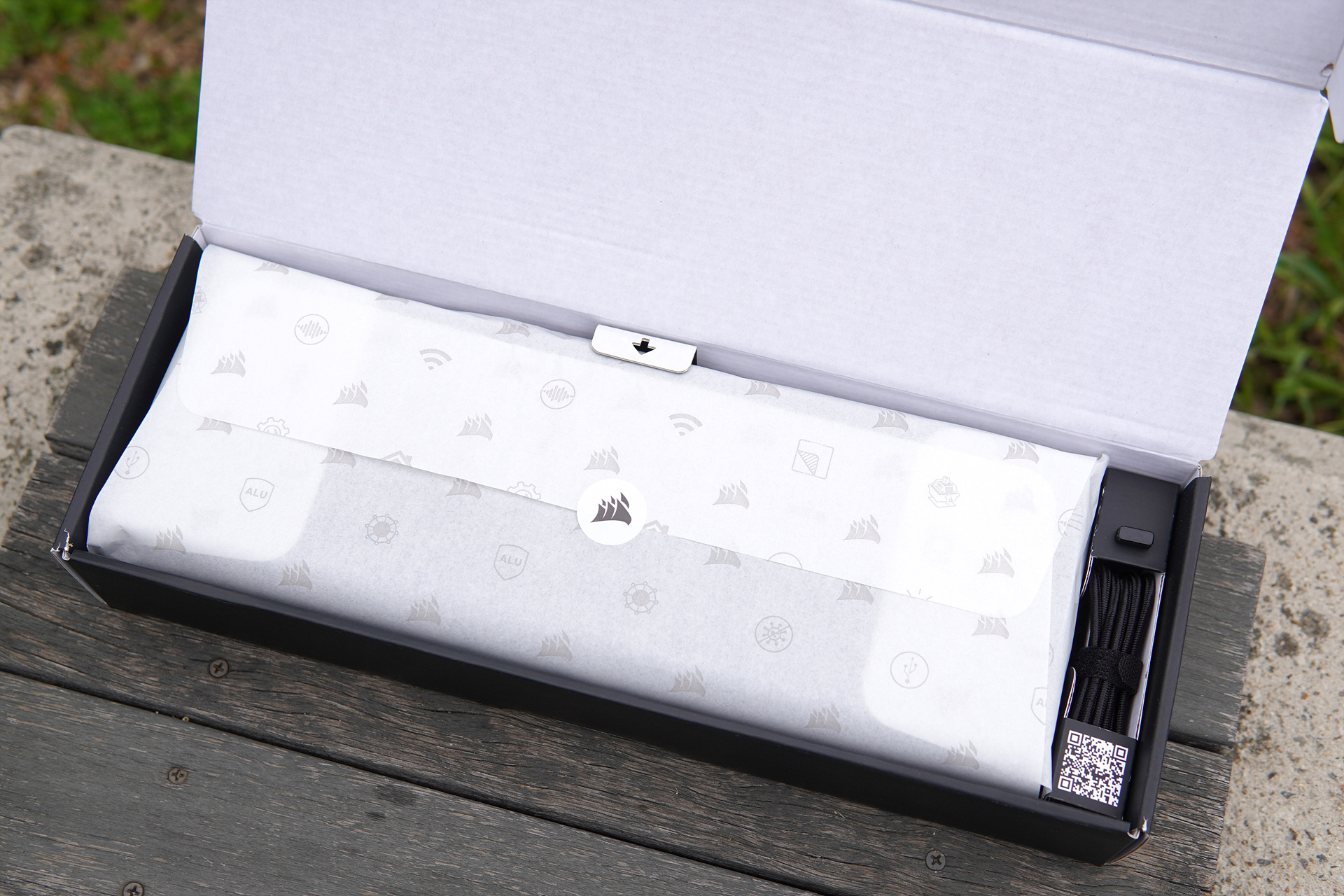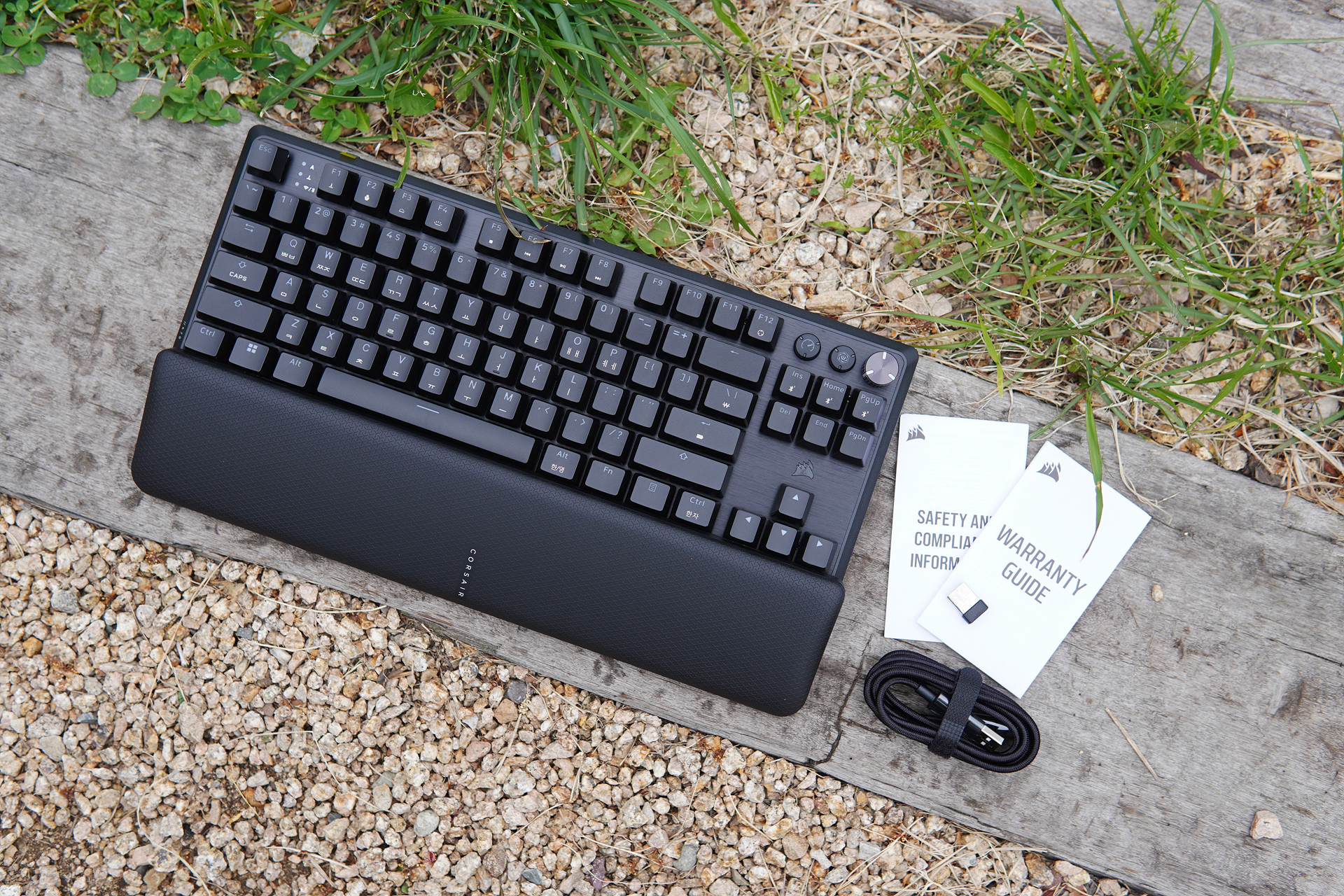 제품의 구성품은 키보드, 손목 받침대, 설명서, 무선 수신기와 C to A 케이블로 이루어져 있습니다. 요즘은 저렴한 키보드라고 해도 키캡 리무버가 기본으로 제공되는데 커세어 로고나 키캡이 있는 리무버를 포함했다면 더욱 좋았을텐데 아쉬운 부분이었습니다.