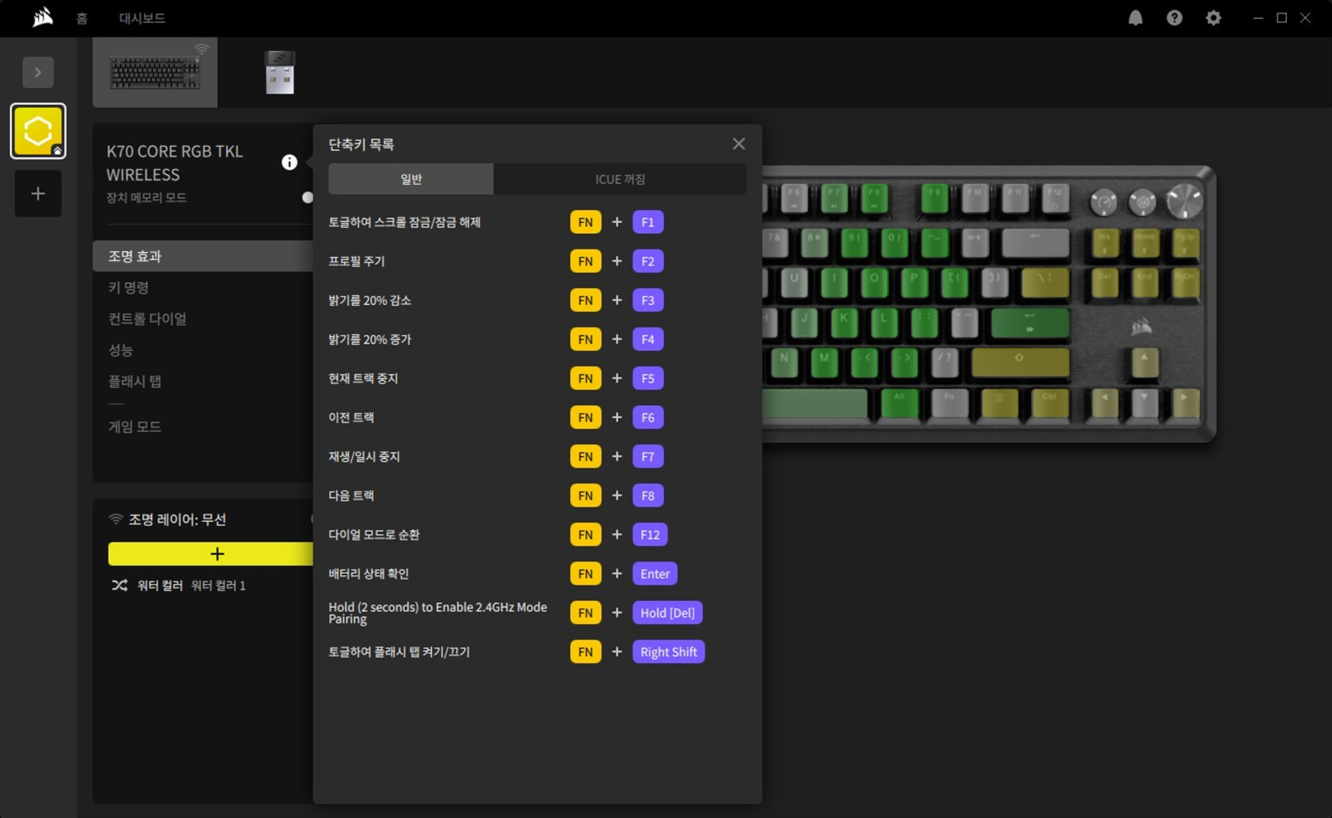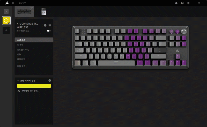 커세어 제품을 사용한다면 iCUE는 무조건 사용해야겠죠. K70을 연결하고 iCUE를 실행하면 기기를 자동으로 등록되며 유선, 무선(동글) 모두 펌웨어 업데이트를 합니다.