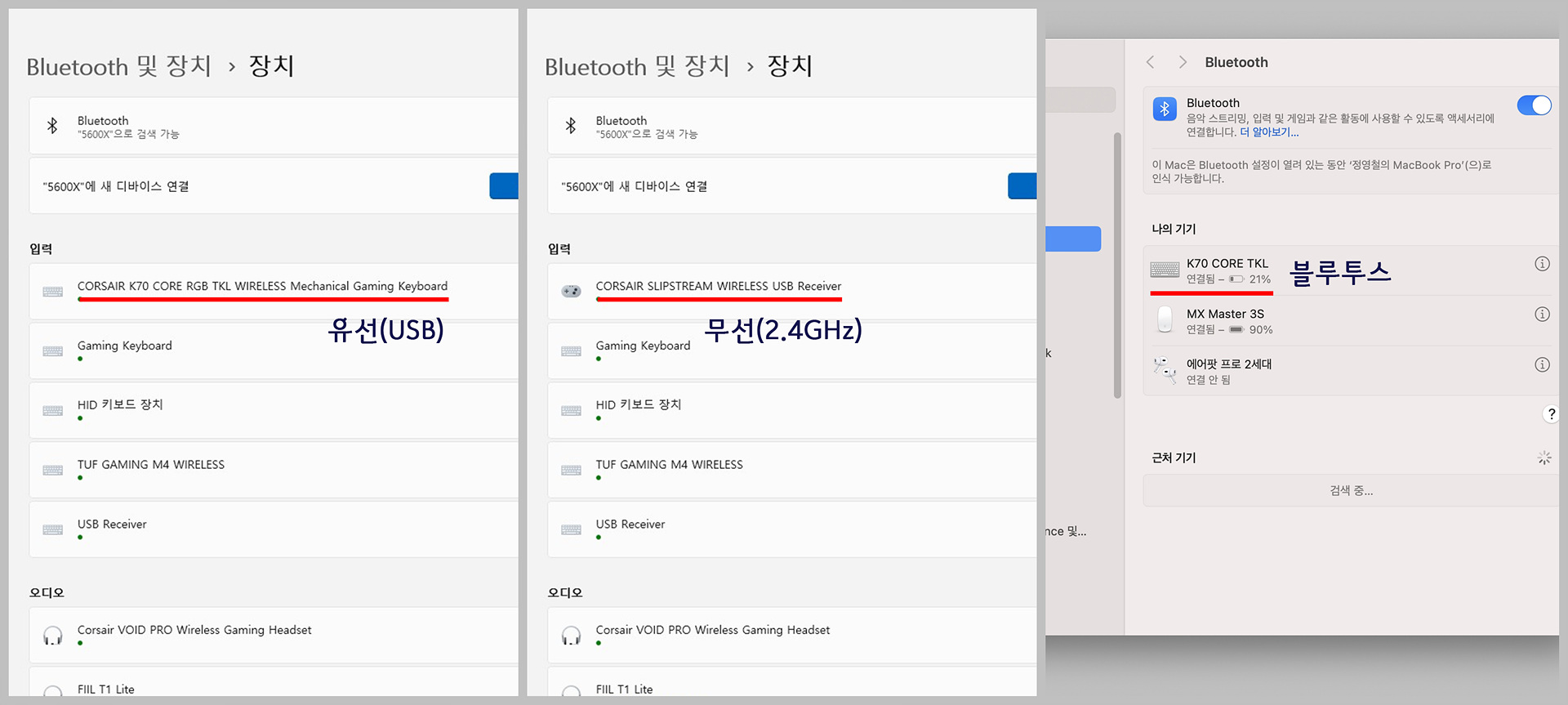 유선, 무선(2.4GHz), 블루투스 기능을 사용하면 최대 5대의 기기와 연결할 수 있어서 데스크톱, 노트북, 태블릿과 같은 기기에서도 편리하게 사용할 수 있습니다.
