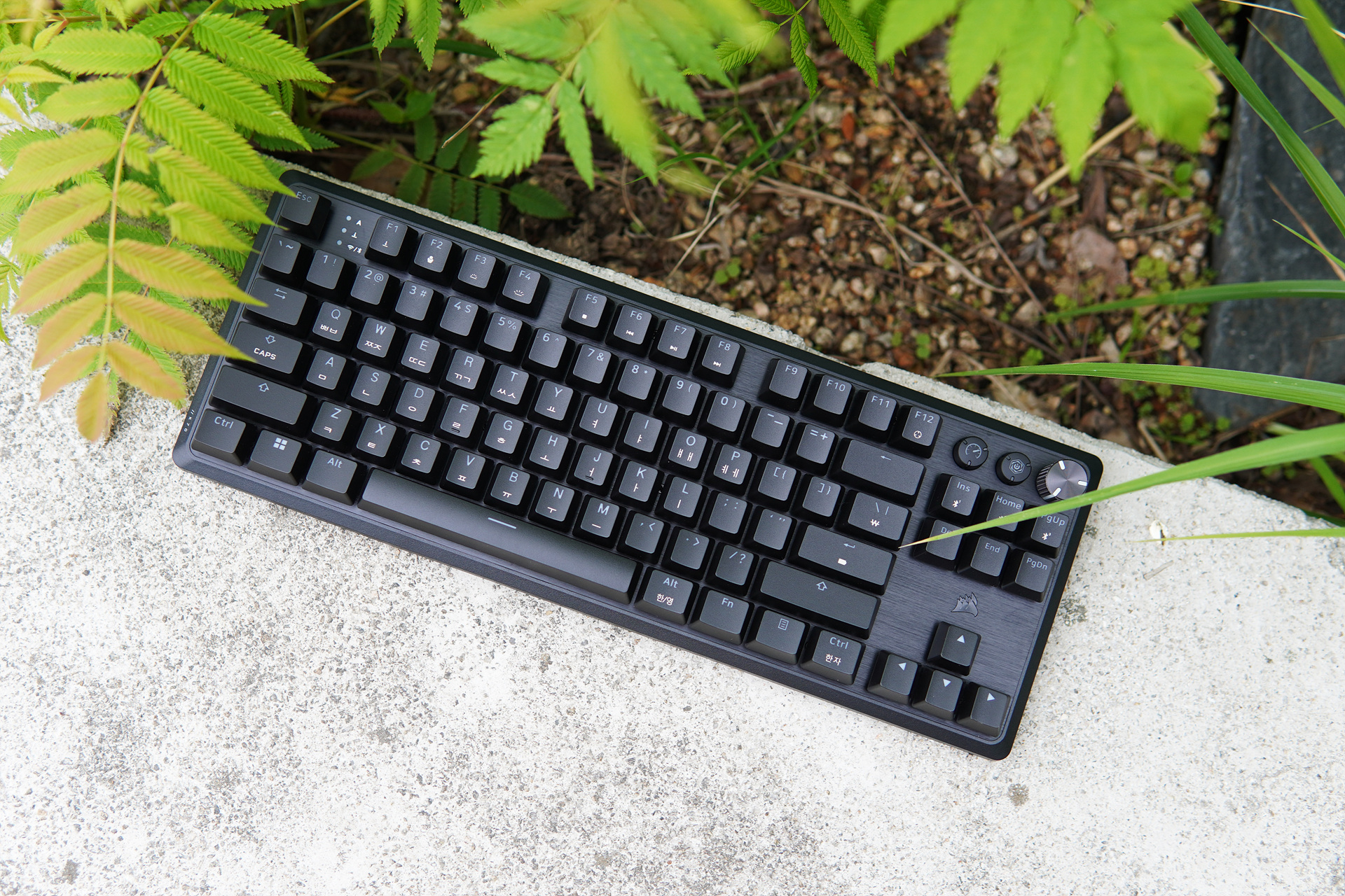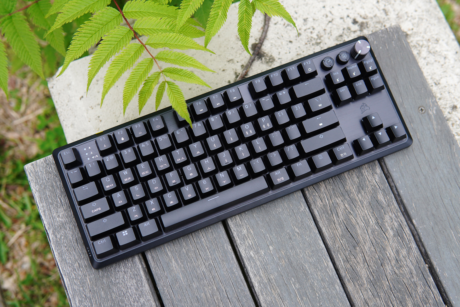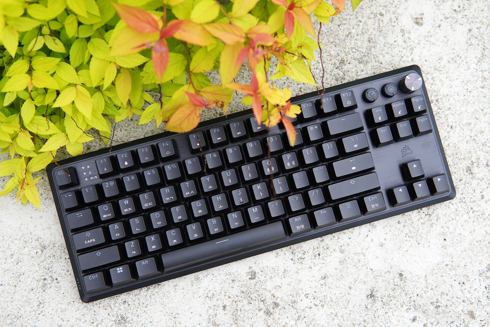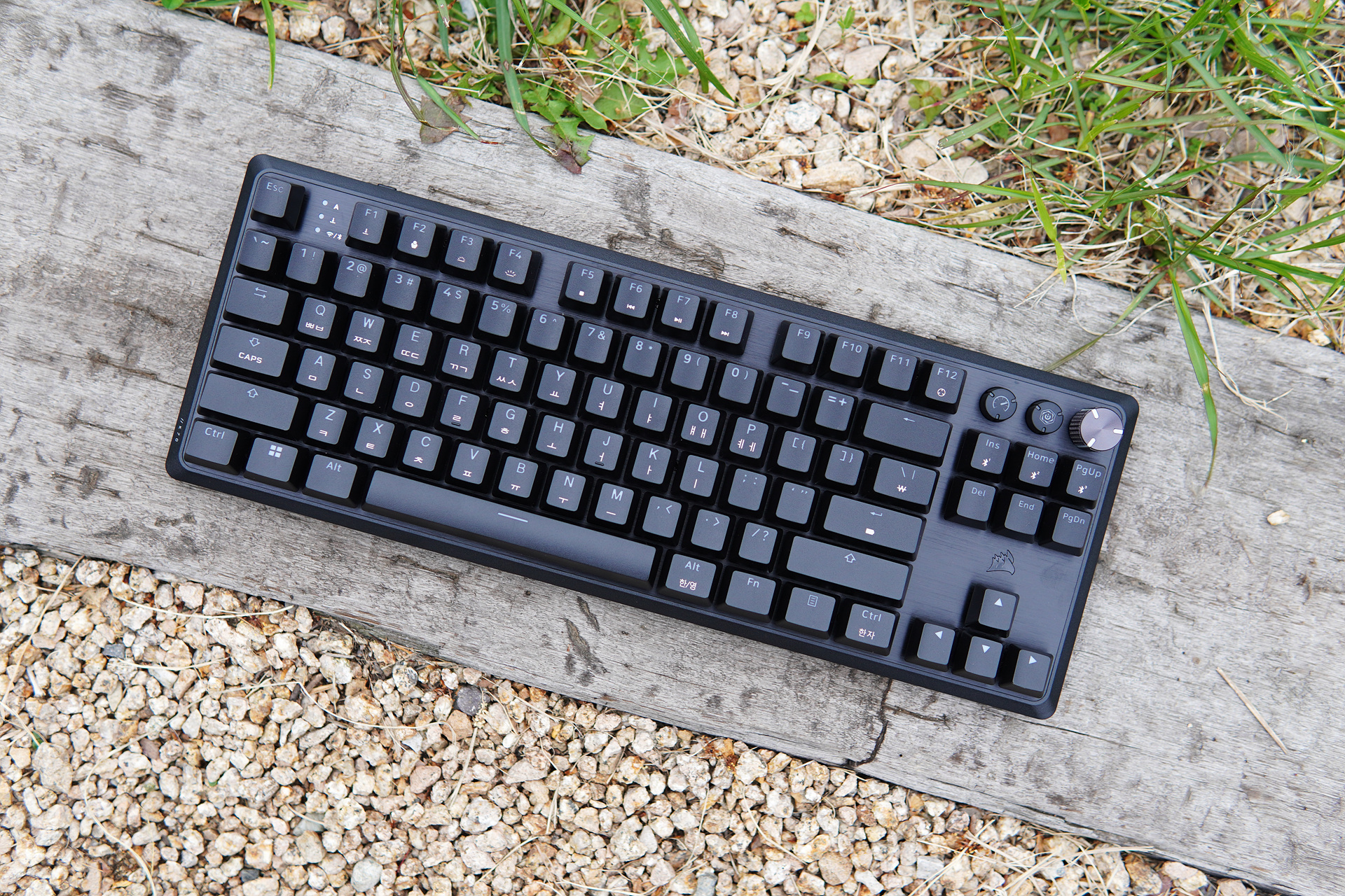 일반적인 텐키리스 배열로 오른쪽 위쪽에 두 개의 버튼과 한 개의 조절 노브(knob)가 눈에 띄네요.
