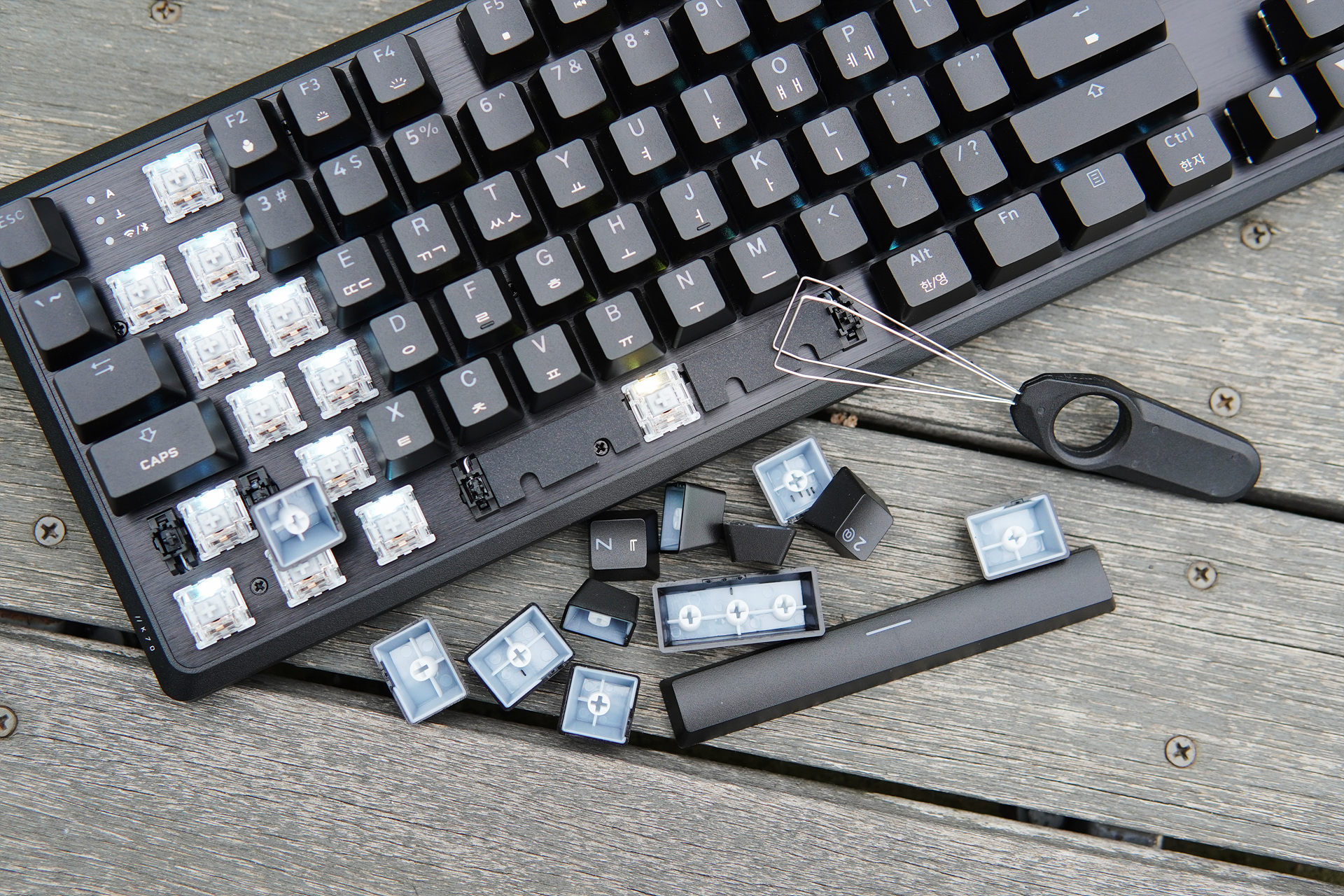 K70을 테스트하면서 가장 놀랐던 부분은 바로 타건감이었습니다. 좀 오래되었지만 처음 은축을 사용했을 때는 짧은 스트로크로 인해 키 입력이 너무 민감하게 반응해서 적응하기 힘들었는데 이번에는 K70에 사용된 스위치는 이런 부분이 완전해 해결이 되었더군요. 기본 윤활과 댐퍼가 적용된 저소음 스위치는 소음면에서도 좋은 성능을 보여주었으며 비키 스타일, 알루미늄 재질이라는 구조적인 문제에도 불구하고 통울림도 준수한 편이었습니다. (영상은 실제 타건 소리와 비슷하지만 크기는 조금 더 큰 편이나 참고해 주세요.) 저소음 스위치 특유의 심심한 느낌도 강하지 않기 때문에 호불호 역시 크지 않을 거라 생각합니다.