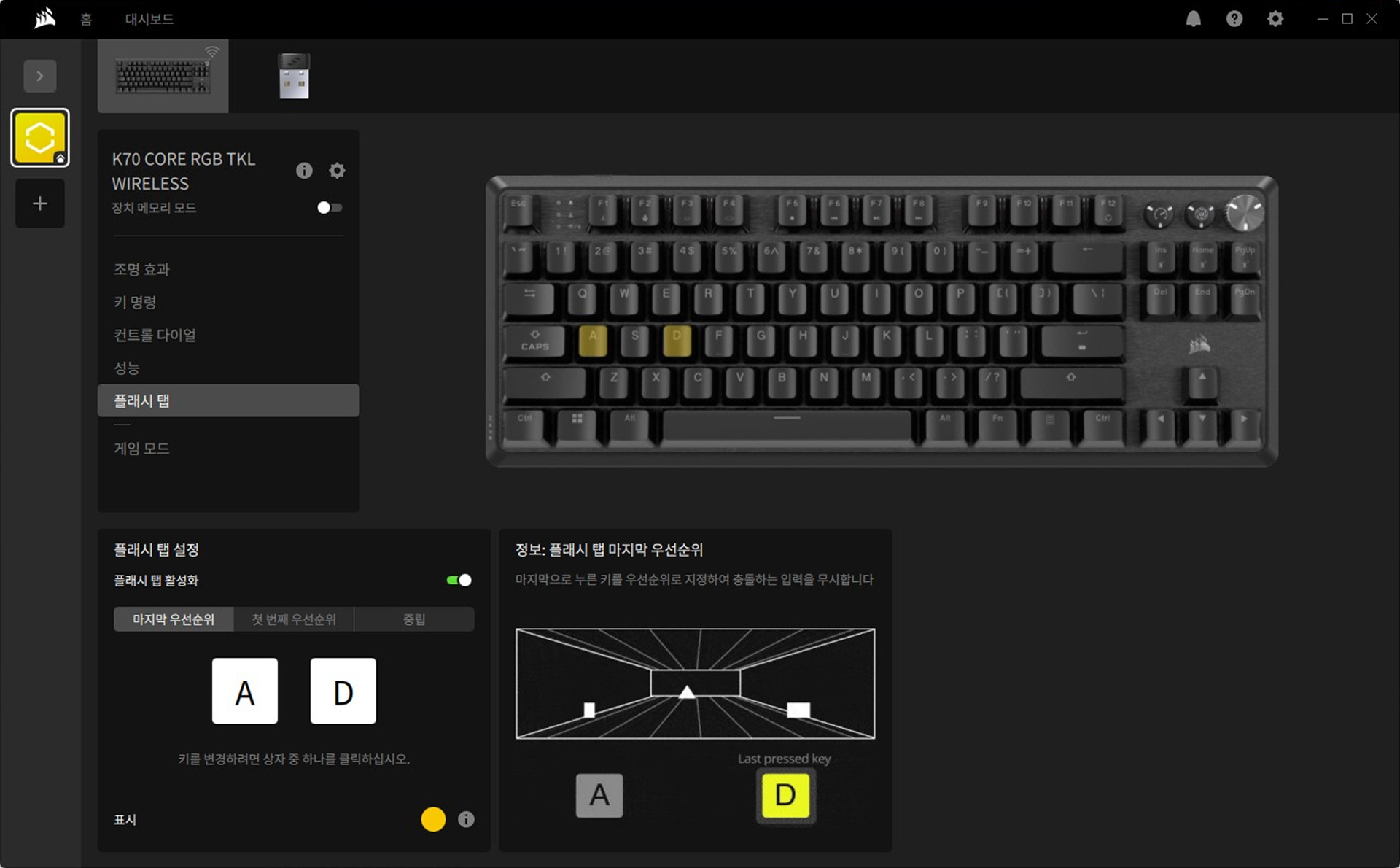 K70의 독특한 기능 중 하나인 플래시 탭은 두 개의 키를 지정해서 마지막으로 눌린 키를 우선적으로 입력하는 기능입니다. 이 기능을 실행하면 A를 누른 상태에서 B를 누르면 B가 실행이 되고 B를 떼면 다시 자동으로 A가 실행이 됩니다. 우선순위는 마지막 / 처음을 바꿔서 지정할 수 있으므로 특정 게임에서 유용하게 사용할 수 있습니다.