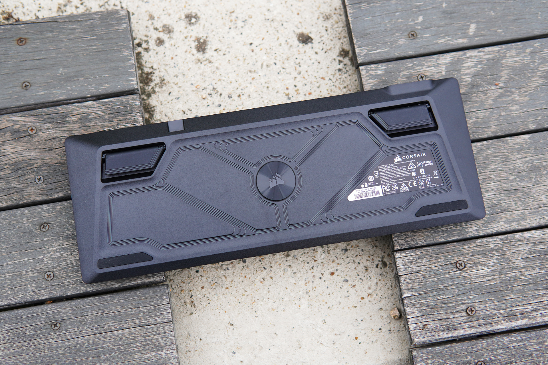 바닥에는 커세어 로고와 함께 약간의 디자인이 적용되었으며 높이 조절용 다리의 크기가 인상적이었습니다.