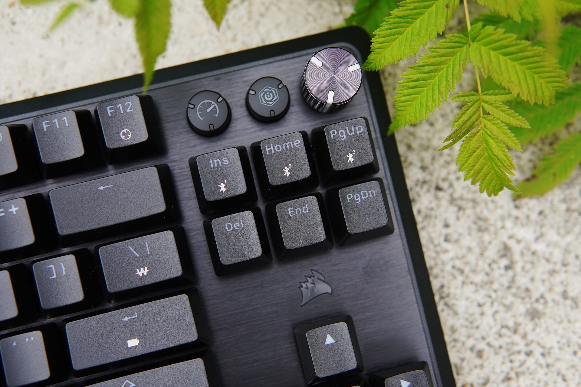 위쪽 측면에는 3가지 모드를 선택할 수 있는 스위치와 케이블을 연결할 수 있는 Type-C 포트가 있습니다. K70은 요즘 키보드에서는 대세가 되어버린 3모드(유선, 무선, 블루투스)를 지원하고 있습니다.