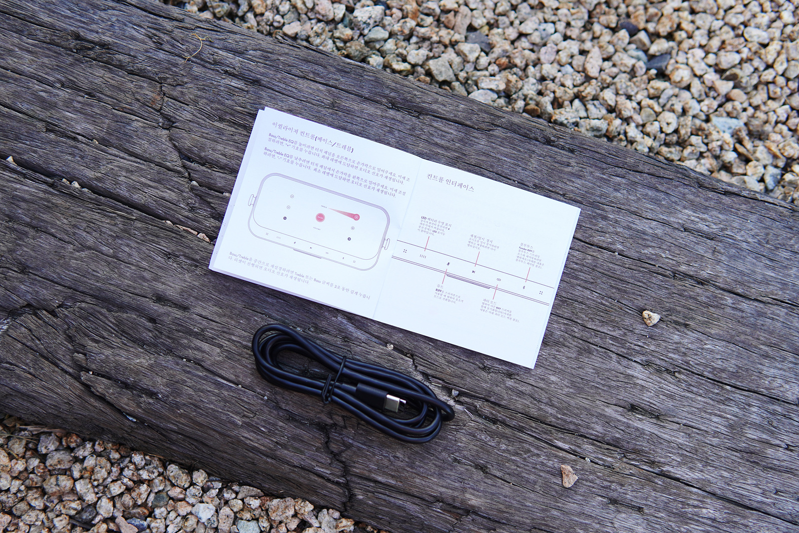 스피커 본체, 충전용 케이블과 설명서로 간단하게 이루어져 있습니다. 일반적인 블루투스 스피커라면 충전기가 없는 게 이상하지 않지만 리프(RIFF)는 45W (15V/2A) 이상의 높은 출력을 가진 충전기가 꼭 필요하기 때문에 현재 사용하고 있는 충전기의 출력을 꼭 확인해야 합니다. 스마트폰의 충전기가 아닌 노트북이나 PD용 멀티 충전기를 사용해야 합니다. 요즘은 노트북을 충전할 수 있는 고출력의 멀티 충전기를 사용하는 분들이 많지만 그래도 기본적으로 45W 이상의 충전기를 포함하는 게 더 좋았을 거라 생각합니다.