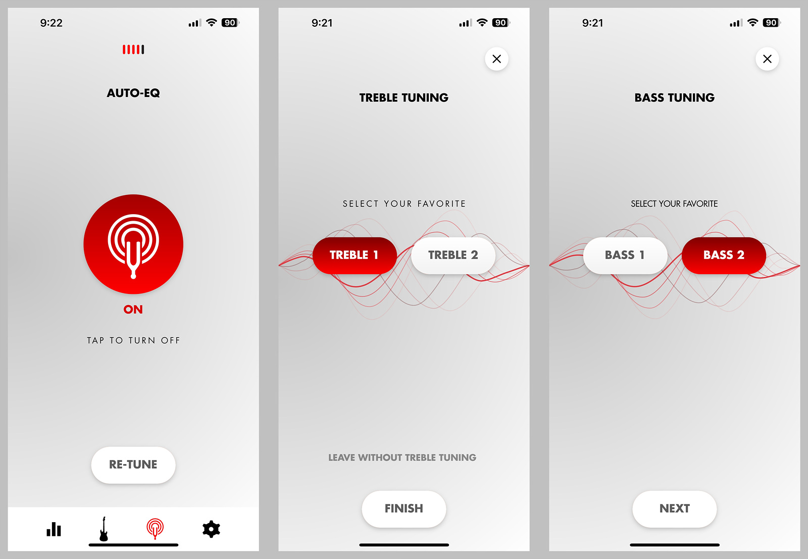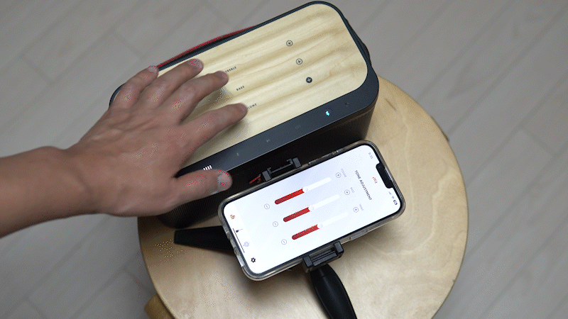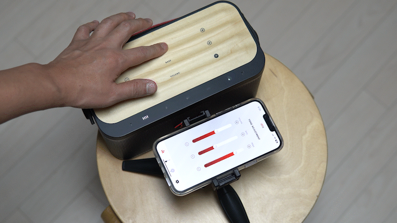 리프가 가진 특별한 기능 중 하나인 Auto-EQ는 스피커에서 Sine Sweep 신호가 두 번 출력되고 스마트폰에서 이 소리를 확인한 뒤 사용자가 BASS / TREBLE 별로 두 개를 선택하면 최종적으로 적용이 됩니다.