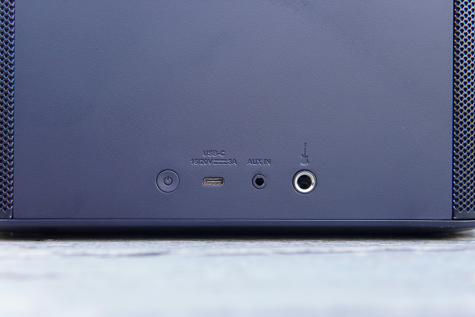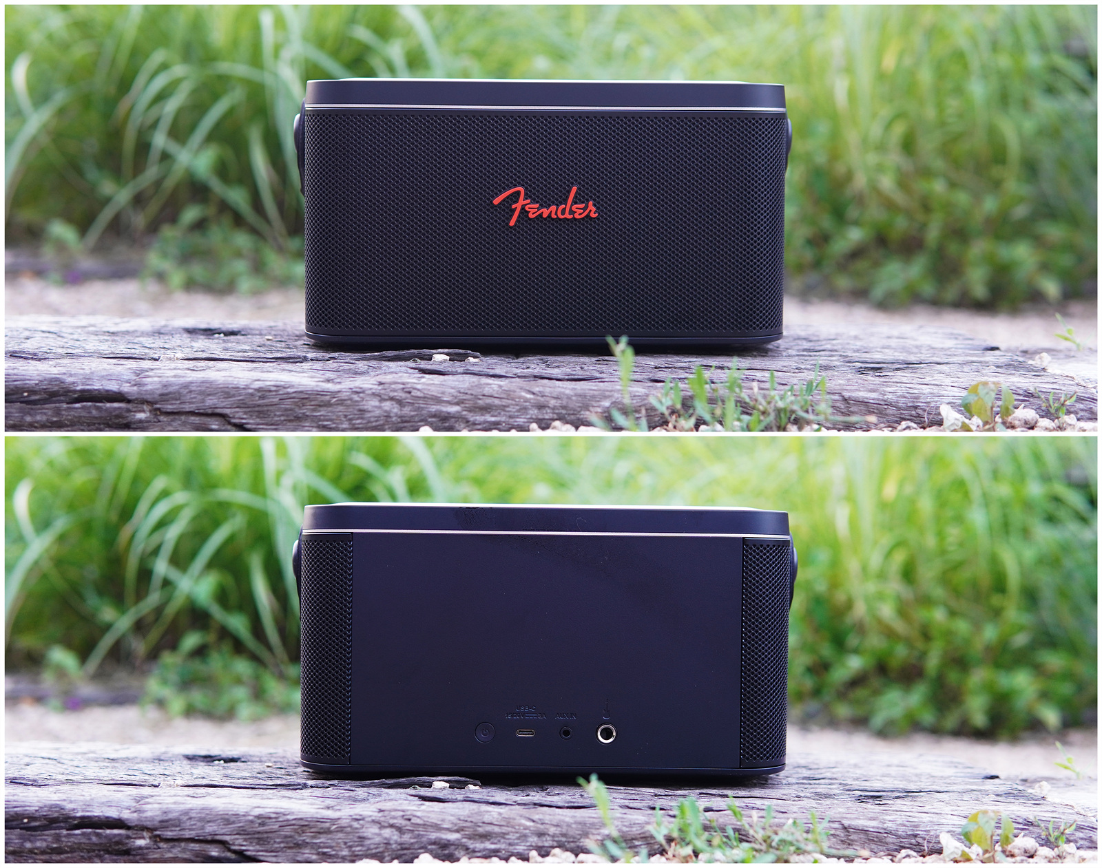 위쪽(상판)은 원목 디자인이 아니라 실제 단풍나무(메이플)가 사용되었으며 기타의 넥(neck)의 모습으로 되어있는 건 펜더(Fender)라서 할 수 있는 디자인이겠죠. 나무 재질이지만 TREBLE / BASS / VOLUME은 터치로 조절할 수 있으며 단순 터치뿐 아니라 스와이프 방식으로 편리하게 쓸어 넘기는 동작이 가능합니다. 아래쪽으로는 배터리, 마이크 음소거, 재생, 파티 모드, 블루투스 페어링을 할 수 있는 터치 버튼이 있으며 양쪽으로 두 개의 마이크가 있습니다. 전체적인 디자인이나 기능에 대한 부분은 사용자에 따라 호불호가 나뉘겠지만 개인적으로는 이전 제품들처럼 별도의 노브(knob)를 장착하는 방식이 더 좋았다고 생각합니다.
